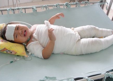 Trong lúc trèo lên cọc sắt dùng để mắc võng, cháu T. không may bị ngã, móc sắt cắm vào hậu môn, gây rách tầng sinh môn, thủng trực tràng.