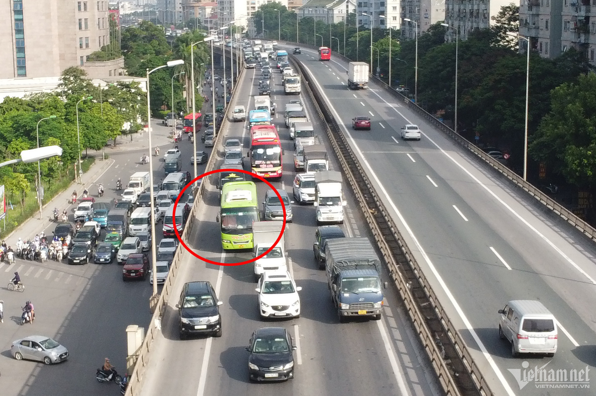 Thời điểm 7h30 ngày 4/7, tại đường Vành đai 3 trên cao (đoạn qua nút giao đường Chu Văn An - Nghiêm Xuân Yêm, quận Hoàng Mai), mật độ phương tiện không quá lớn nhưng nhiều ô tô khách (từ 16 - 45 chỗ ngồi) vẫn cố tình đi vào làn đường khẩn cấp.