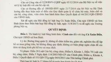 Huyện Hương Sơn đã ra quyết định kỷ luật cảnh cáo đối với Chủ tịch xã Sơn Bình vụ dùng tiền hỗ trợ mua bò của hộ nghèo để làm đường
