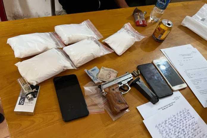 Đối tượng Hải khai nhận chất bột màu trắng trên là ma túy loại ketamin. Lực lượng công an cũng đã thu giữ 1 súng bắn đạn cao su, 4 viên đạn màu vàng đồng trên người đối tượng này.