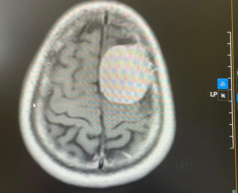 Các bác sĩ đã tiến hành khám và chỉ định chụp cộng hưởng từ có tiêm thuốc cản quang để tìm nguyên nhân và phát hiện khối u kích thước 36x48x54 mm vùng trán đỉnh trái của bệnh nhân. Sau ca phẫu thuật kéo dài hơn 4 giờ, khối u lớn trong não đã được lấy ra trọn vẹn.