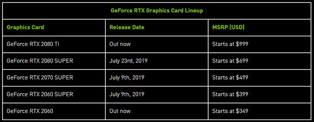 Thế nhưng giờ đây, chưa đầy 6 tháng sau khi Nvidia cho ra mắt bộ card đồ họa trên, họ lại tiếp tục ra mắt thêm một bộ thế hệ GPU mới. Với các mức giá là 400 USD cho RTX 2060 Super, 500 USD cho RTX 2070 Super và 700 USD cho RTX 2080 Super.