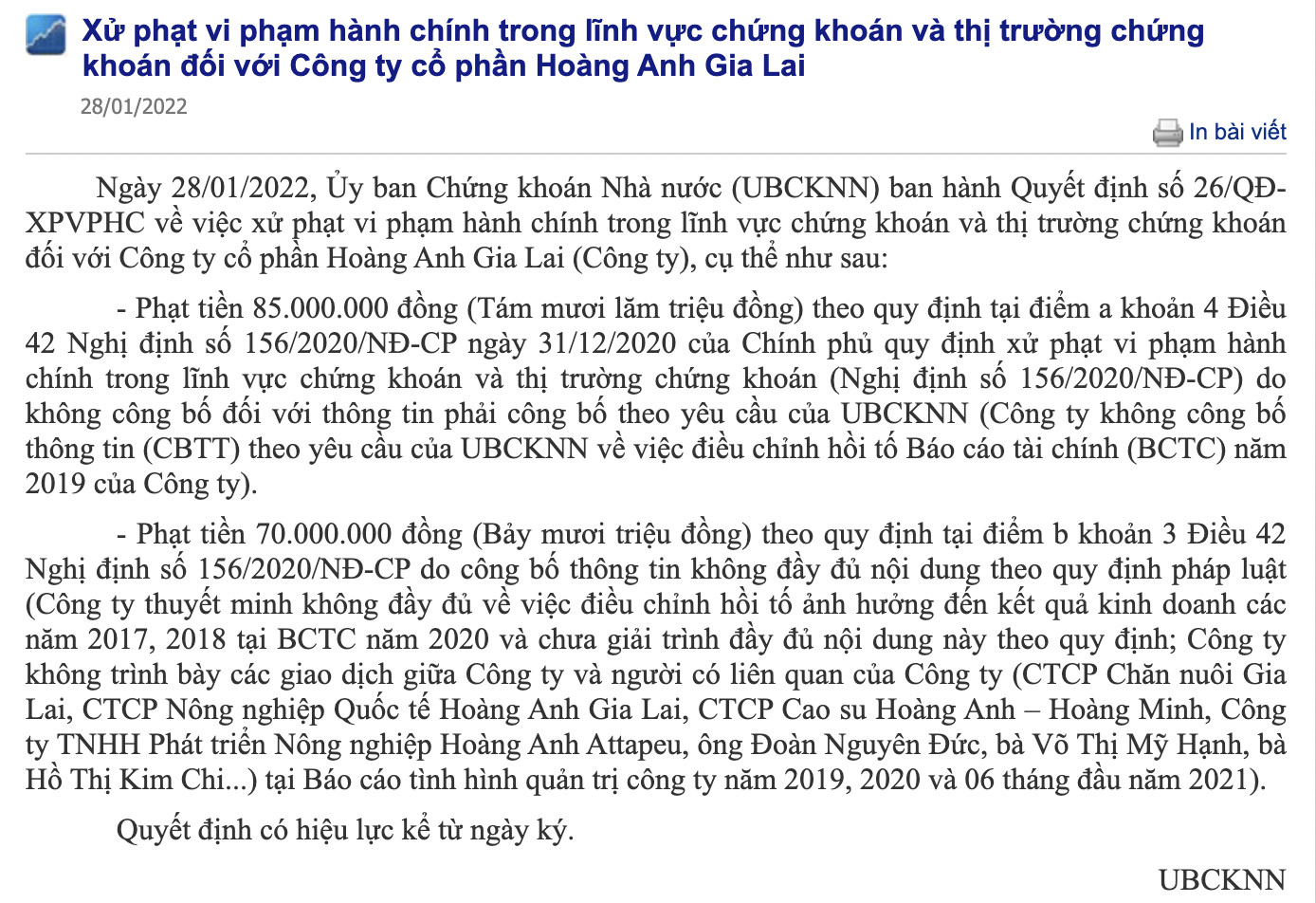 Thông tin xử phạt của UBCKNN đối với vi phạm của HAGL trong vấn đề công bố thông tin (Ảnh chụp màn hình).