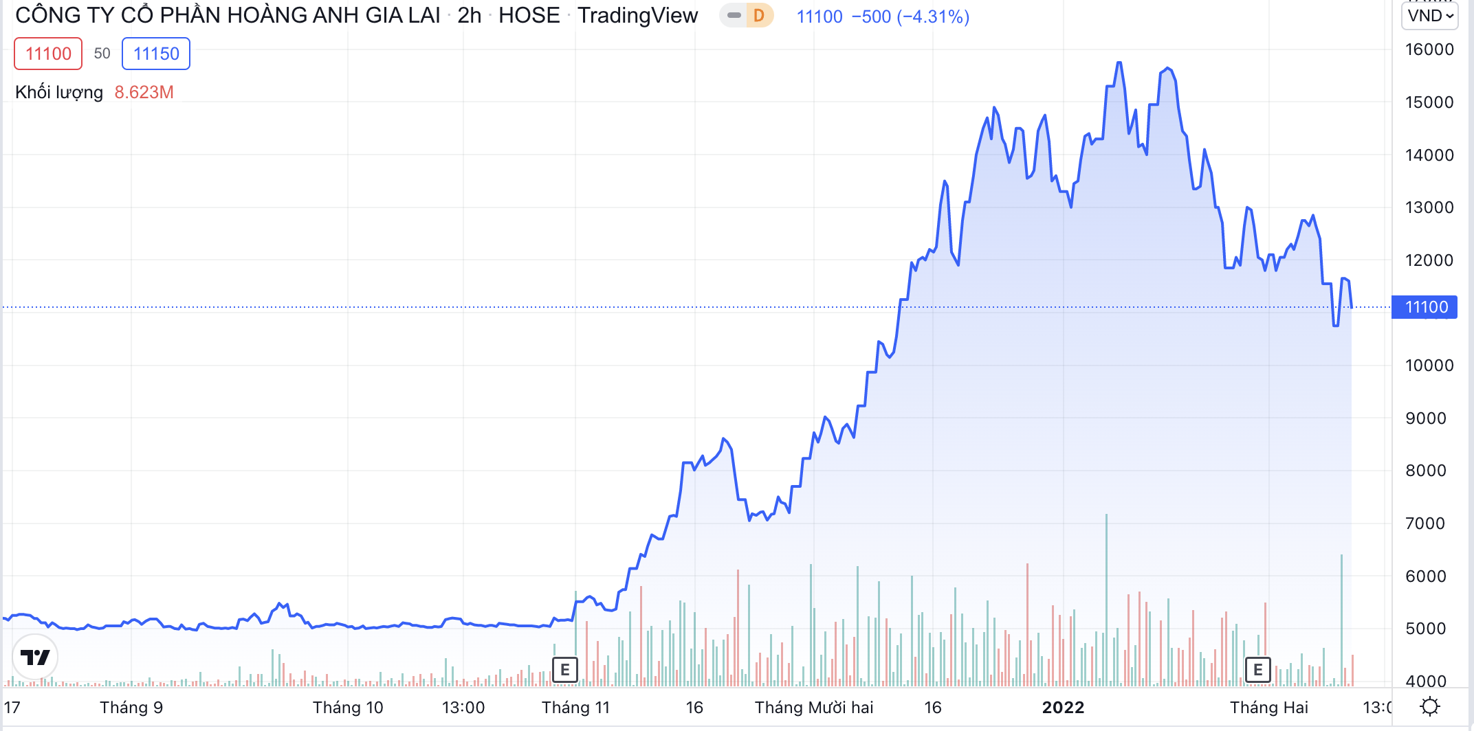 Cổ phiếu HAG được giao dịch ở vùng 5.000 đồng/cổ phiếu trong một thời gian trước khi "nổi sóng" tăng mạnh vào cuối tháng 10/2021 rồi đạt đỉnh vào giữa tháng 1 năm nay (Ảnh chụp màn hình).