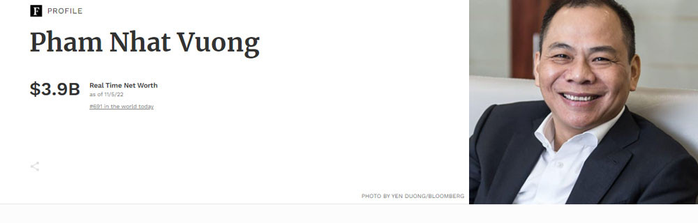 Trước đó, ông Phạm Nhật Vượng được cho là có thể sớm lọt top 40 người giàu nhất trên thế giới khi tài sản trên 6 tỷ USD và kỳ vọng vào thương vụ phát hành cổ phiếu Vinfast, niêm yết tại Mỹ thành công. Tuy nhiên, kế hoạch này đang bị chậm.