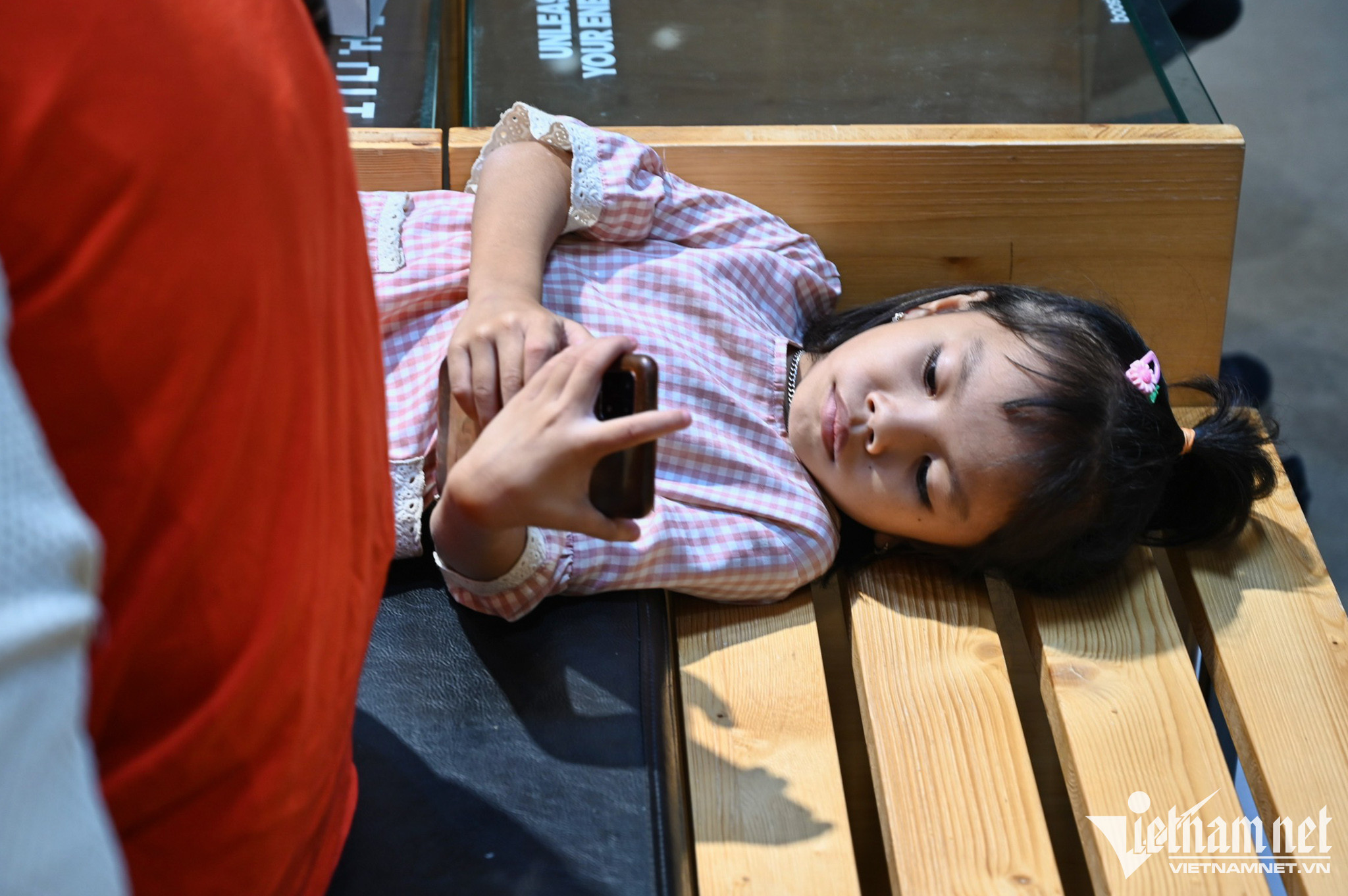 Nhiều em nhỏ theo bố mẹ đi mua sắm được "cấp" cho chiếc điện thoại trong thời gian chờ đợi. Minh Anh (phải) ngồi đọc cuốn sách mới mua được trong lúc chờ các chị gái đi lựa đồ.