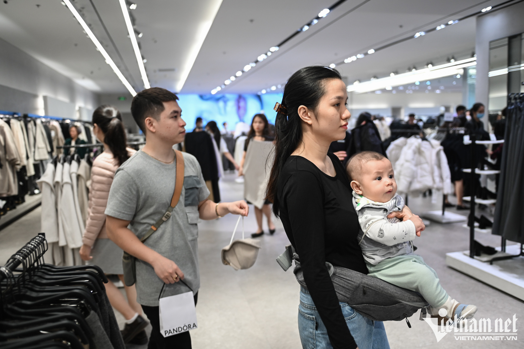 Anh Quang Hưng đang bế con gái đứng ngoài cửa thì cô bé đòi vào trong tìm mẹ. Hai bố con ngơ ngác một lúc bên trong khu vực bán giày dép, túi xách. "Tôi không thấy phiền đâu, ngược lại còn rất vui vì cả nhà được đi chơi. Nhân dịp này cũng muốn mua ít đồ cho bà xã và con gái", anh Hưng chia sẻ.
