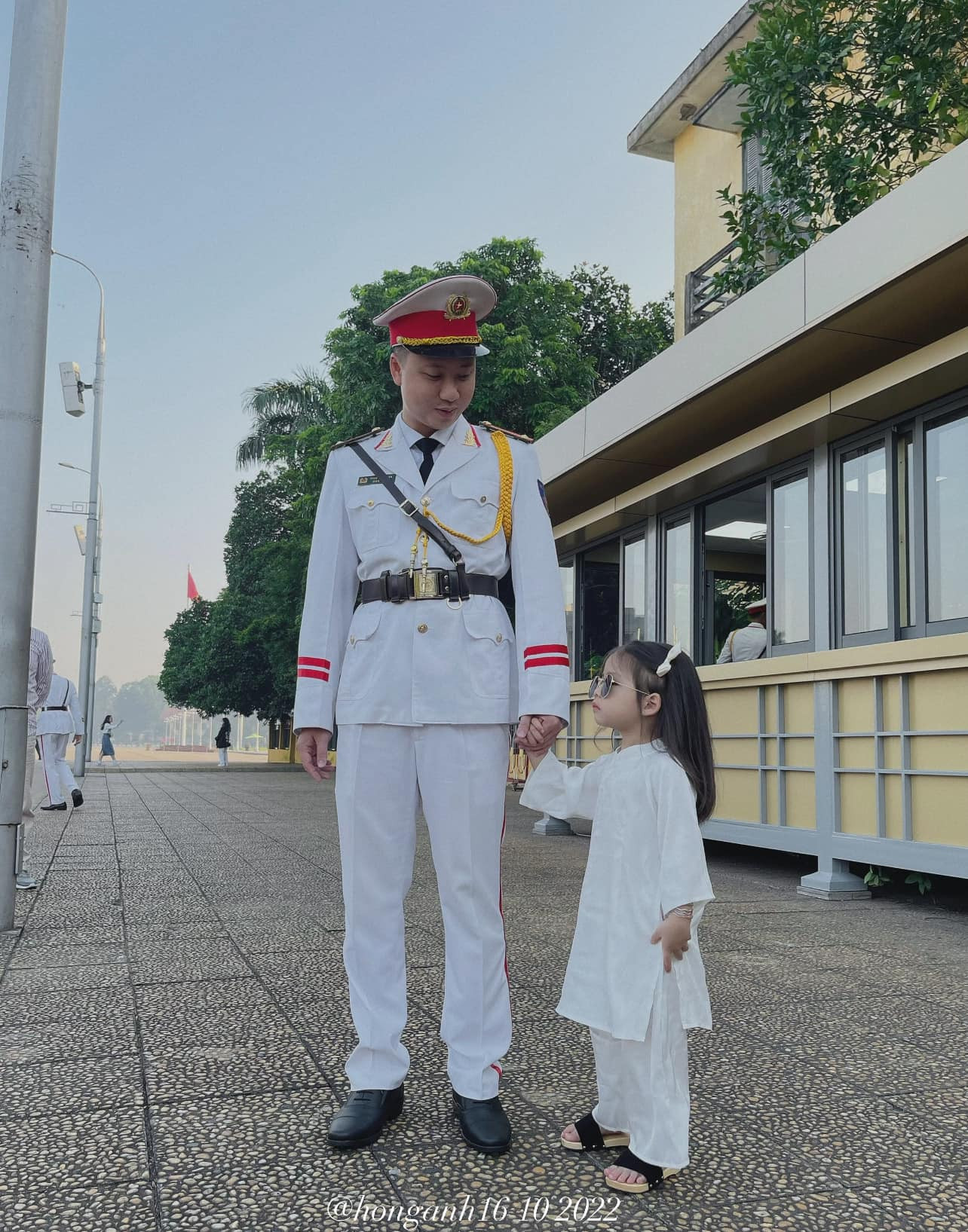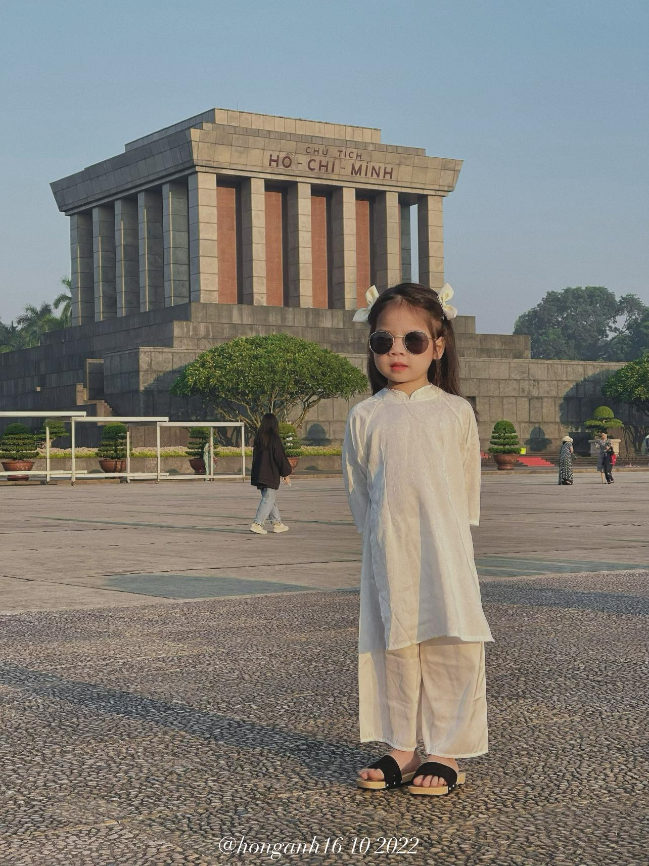 Điểm đến đầu tiên của Tú An là Lăng Bác. Lần đầu tiên Tú An được xem lễ thượng cờ. Em háo hức và thích thú vô cùng, liên tục nhìn ngó và tò mò hỏi mẹ thật nhiều câu hỏi. Sau khi lễ thượng cờ kết thúc, Tú An bắt đầu đứng tạo dáng cho mẹ chụp ảnh.
