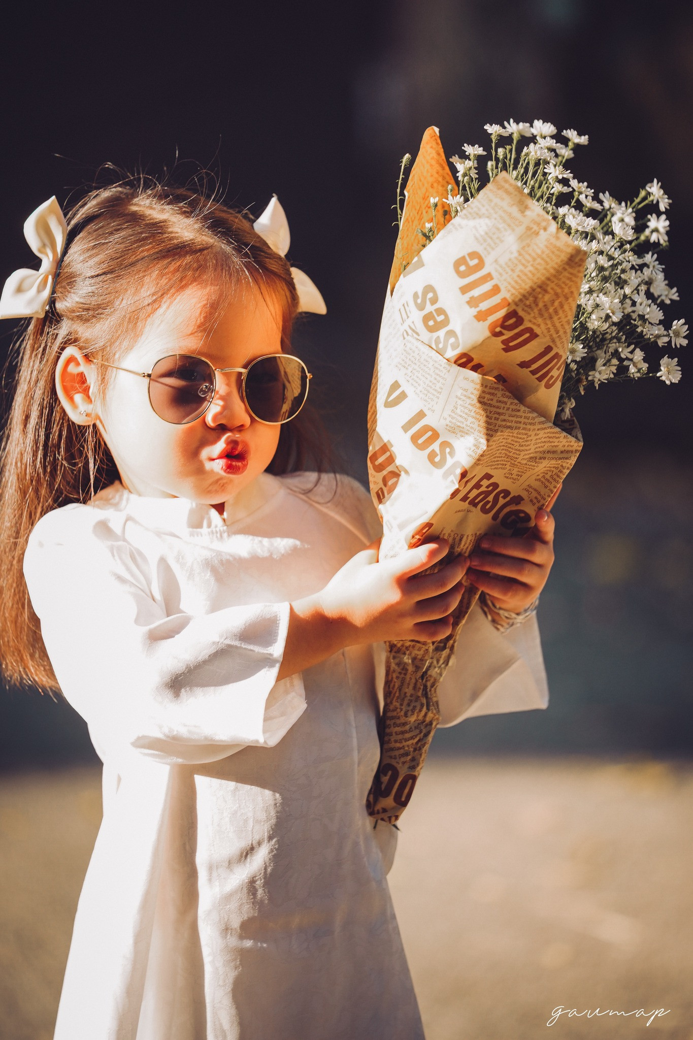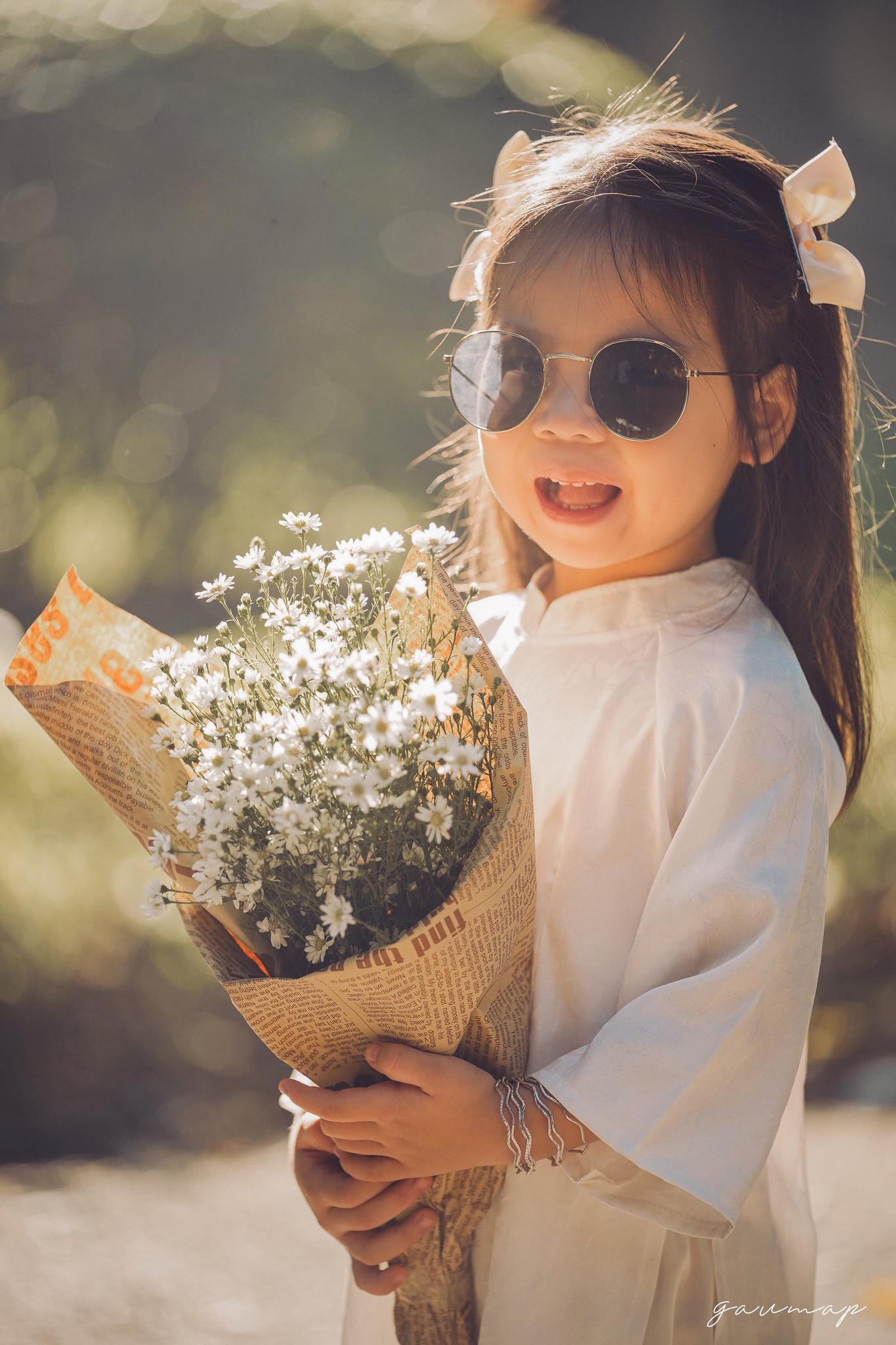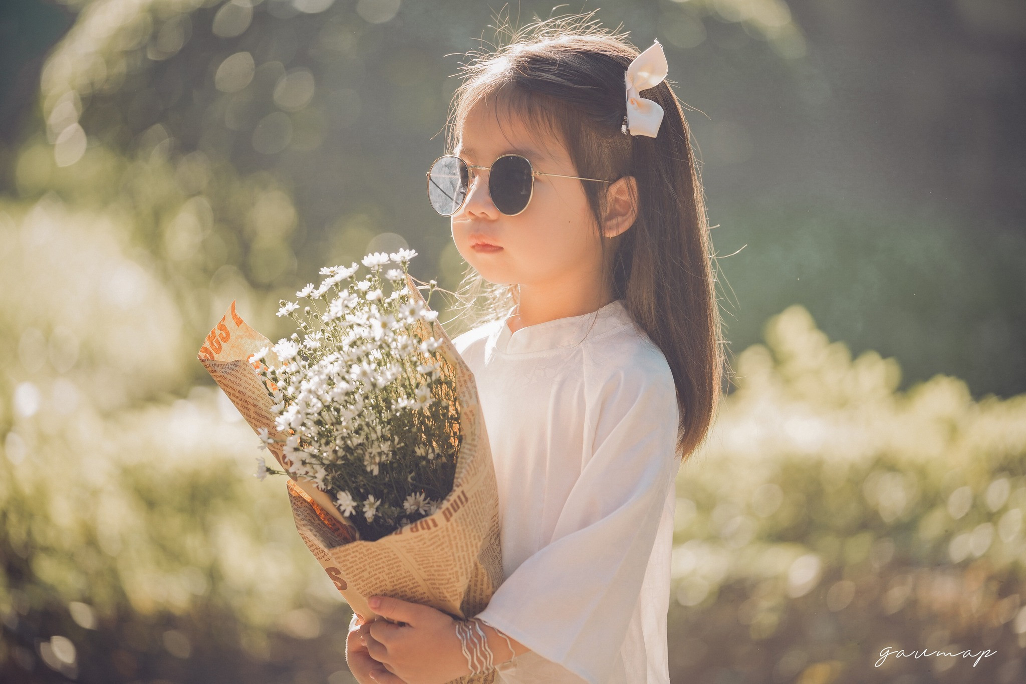 Không cần mẹ phải chỉ cách tạo dáng, cùng với bó hoa cúc hoạ mi và chiếc kính, Tú An rất tự nhiên với những biểu cảm đáng yêu khi chụp ảnh.