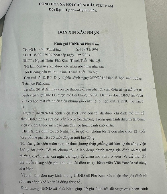 Phòng CTXH Bệnh viện Việt Đức cho biết, trường hợp bệnh nhi Bùi Duy Nghĩa từng được phẫu thuật thay van hai lá cơ học, hiện đã có chỉ định thay động mạch chủ lên và sửa van hai lá. Nhưng bởi gia cảnh khó khăn, cha mẹ em vẫn chưa đủ lo đủ tiền. Chi phí cho ca phẫu thuật dự kiến khoảng 50 triệu đồng, chưa tính điều trị sau mổ và thuốc ngoài. Phía phòng CTXH cũng đang liên hệ, kết nối với các nhà hảo tâm để hỗ trợ thêm.