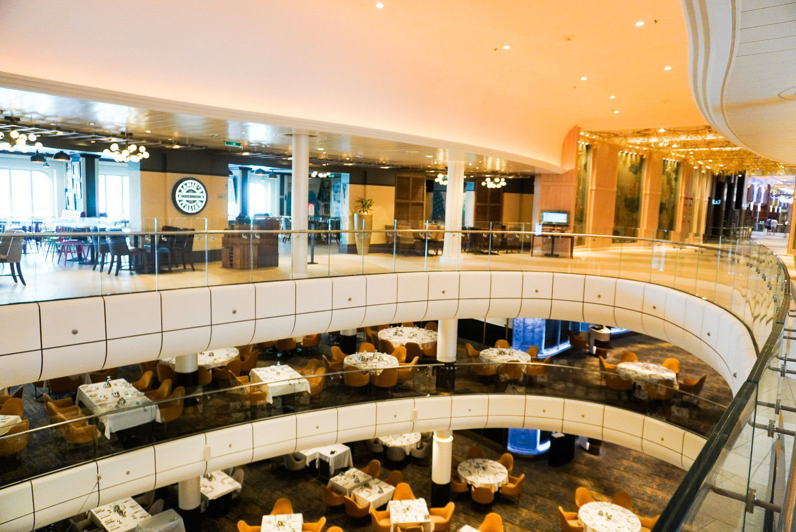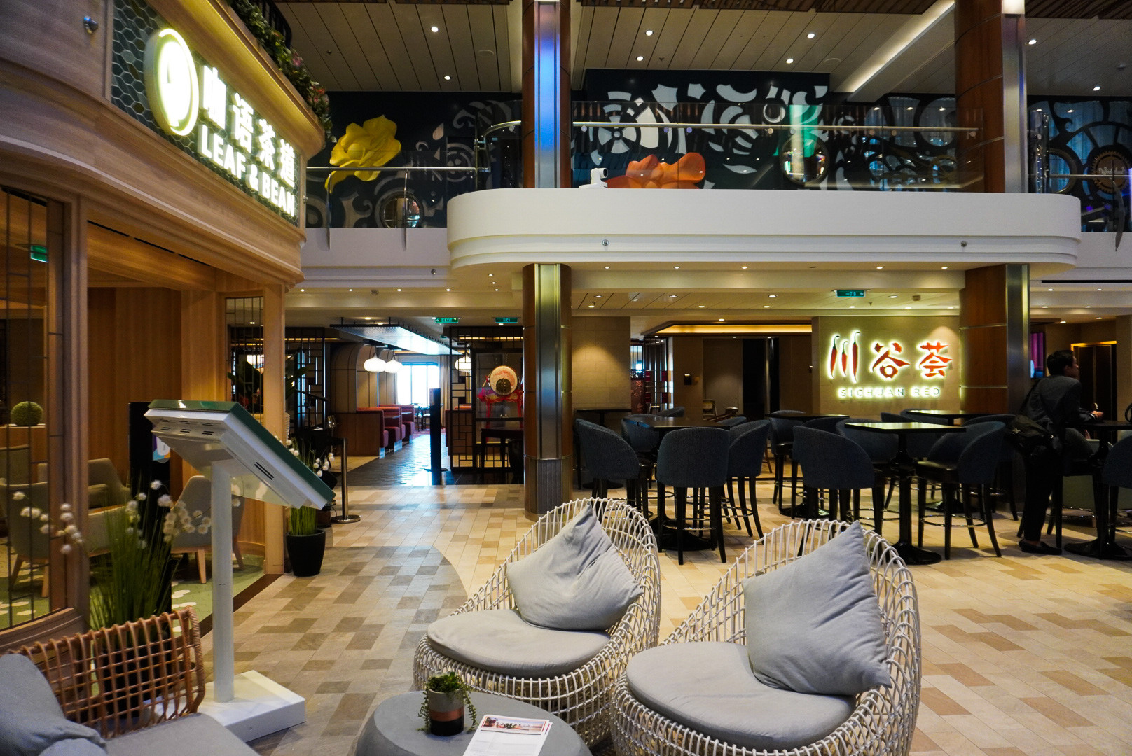 Bên trong du thuyền với nội thất hiện đại, sang trọng, giống như một trung tâm thương mại thu nhỏ trên tàu, có 20 nhà hàng phục vụ các món Tây và ẩm thực đến từ các quốc gia châu Á như Trung Quốc, Nhật Bản.