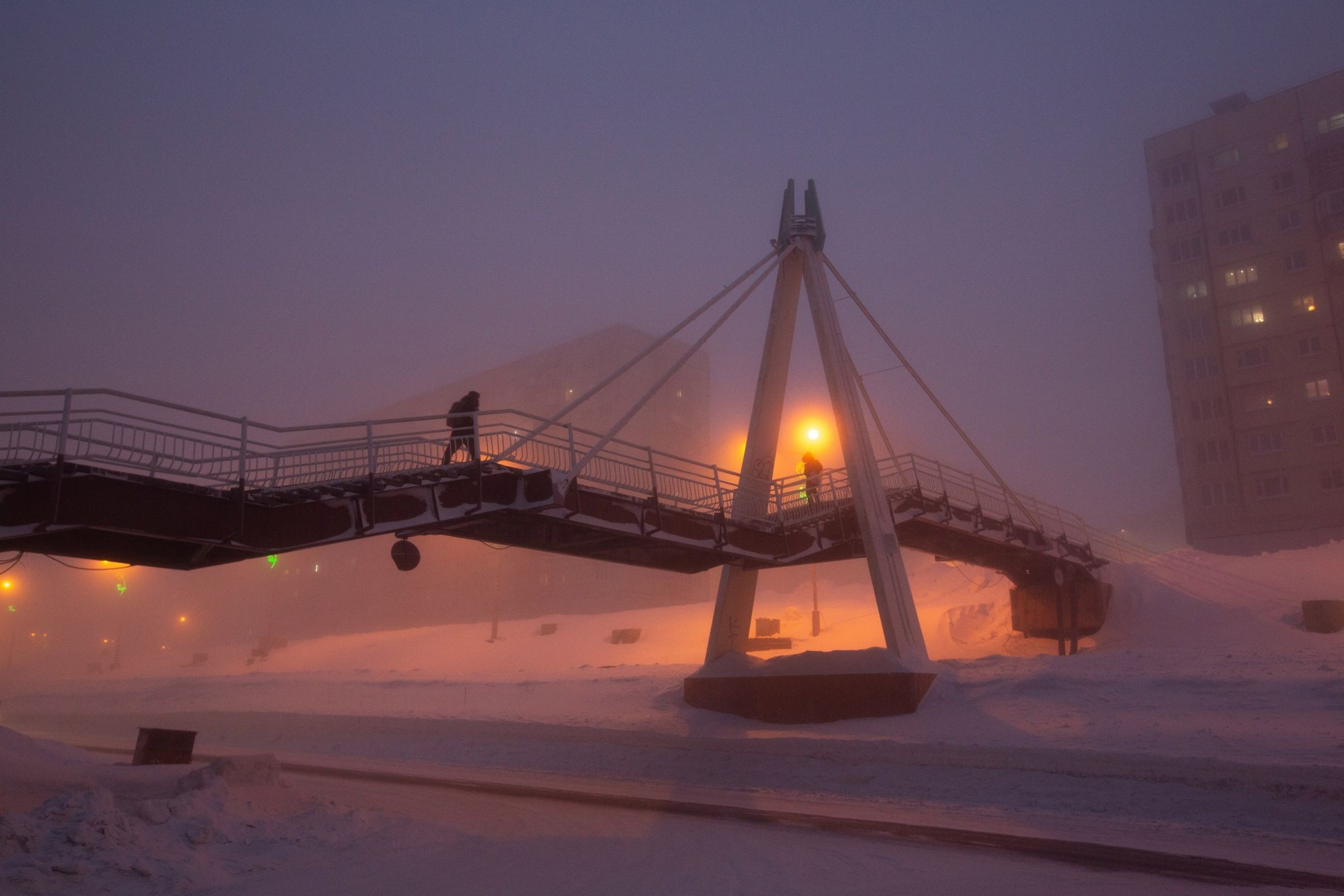 Đêm vùng cực ở Norilsk kéo dài 45 ngày, bắt đầu từ cuối tháng 11. Trong khoảng thời gian này, thành phố sẽ không nhìn thấy ánh mặt trời. |