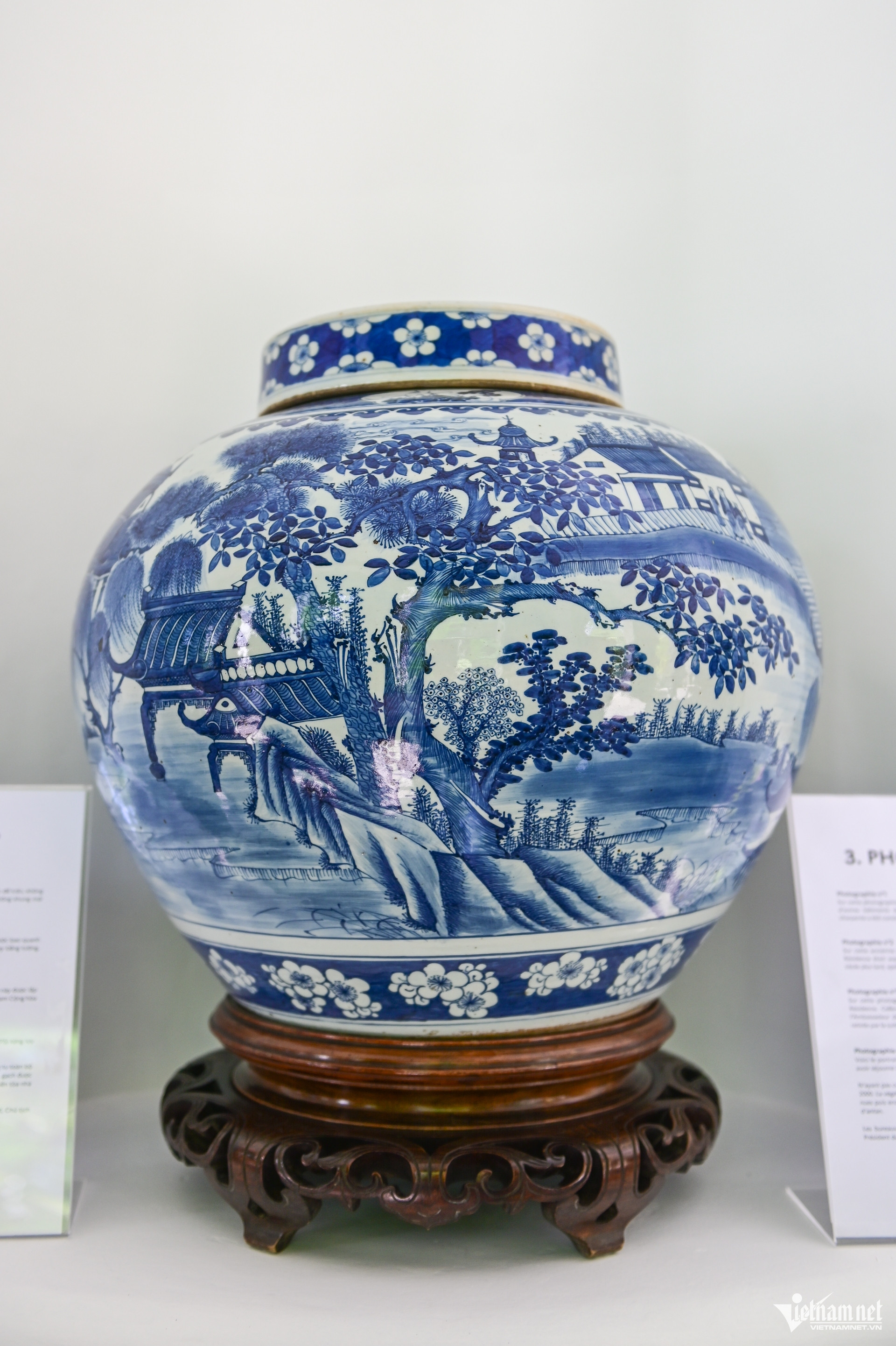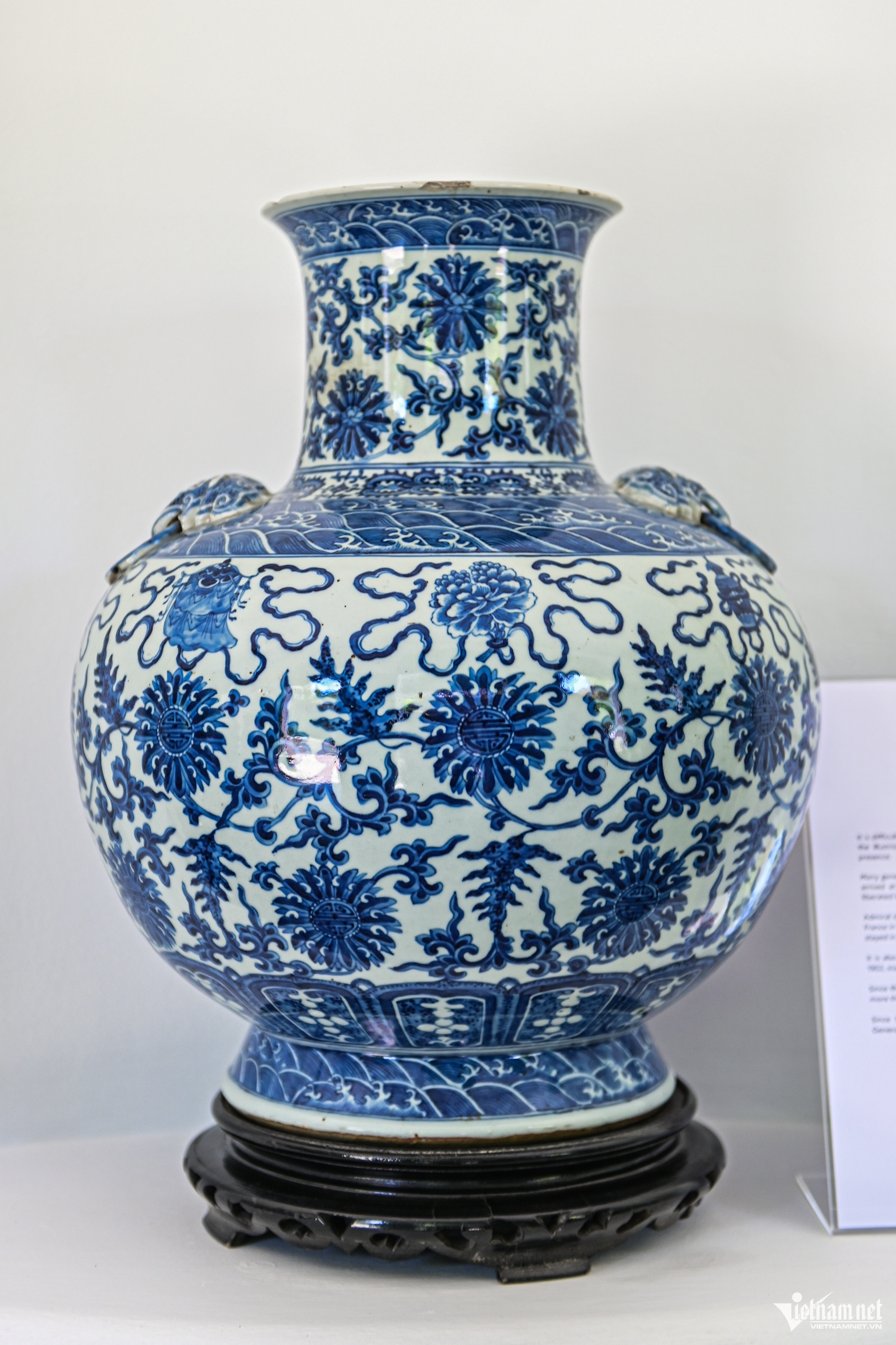 Phòng ăn nhỏ còn là nơi trưng bày các đồ sứ với hoa văn màu xanh cô ban, được bài trí trên đồ nội thất bằng gỗ, gọi là "Màu xanh Huế". Các họa tiết và hình dáng trên từng món đều được thiết kế riêng, phản ánh thẩm mỹ cung đình.