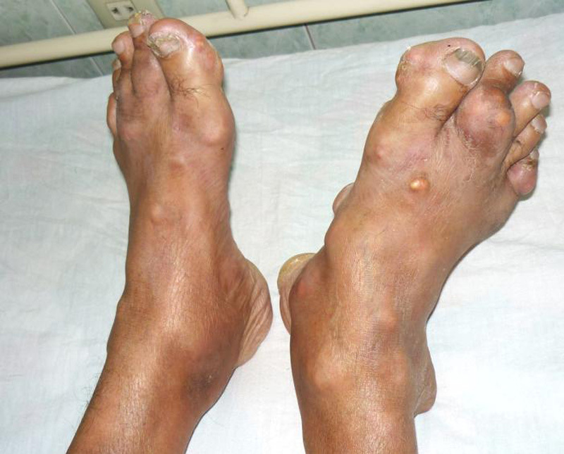 Ở các khớp tay, các cục u vỡ ra, lở loét và hoại tử tới mức phải tháo khớp. Đó là biến chứng của bệnh gút do các cuộc ăn nhậu gây ra.