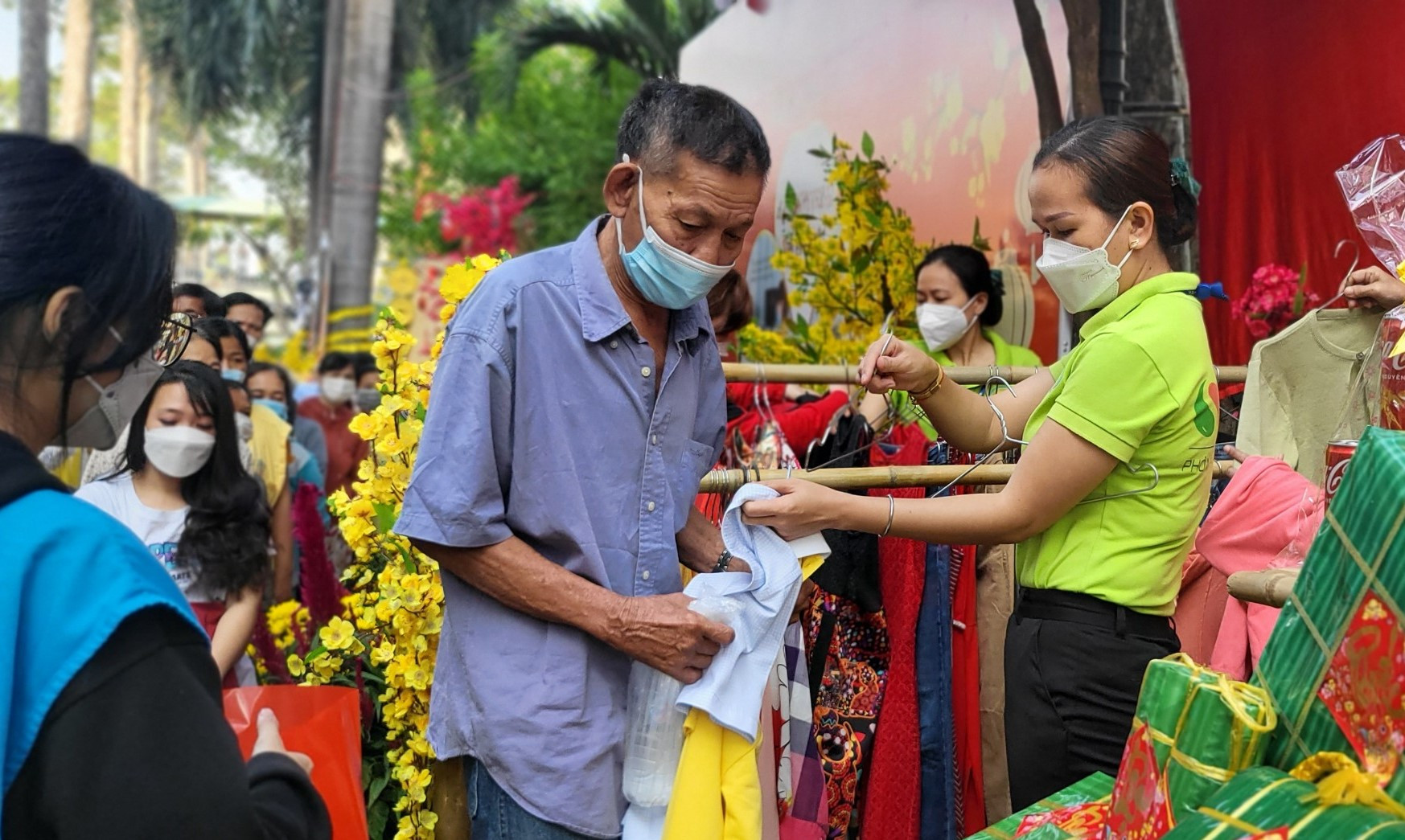 Ở một góc khác, người bệnh nghèo và khó khăn xếp hàng dài để chờ nhận quà cho năm mới. Đây là gian hàng từ thiện của Phòng Công tác xã hội, áo quần được là là phẳng phiu, gọn gàng.