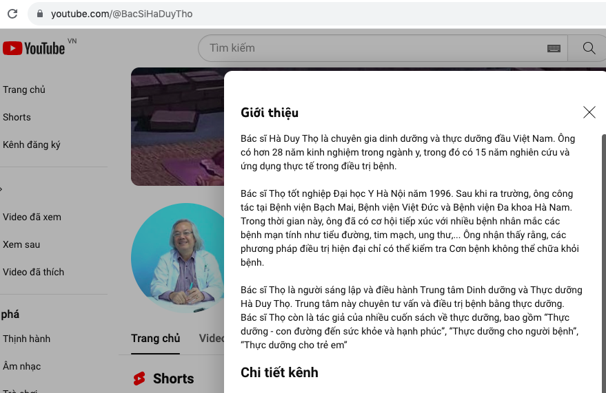 Trên YouTube, một kênh có tên "bác sĩ Hà Duy Thọ" với hàng nghìn người đăng ký theo dõi, đăng tải nhiều clip ngắn giới thiệu ông này là "chuyên gia dinh dưỡng và thực dưỡng, tốt nghiệp Đại học Y Hà Nội năm 1996, công tác tại Bệnh viện Bạch Mai, Bệnh viện Việt Đức và Bệnh viện Đa khoa Hà Nam".