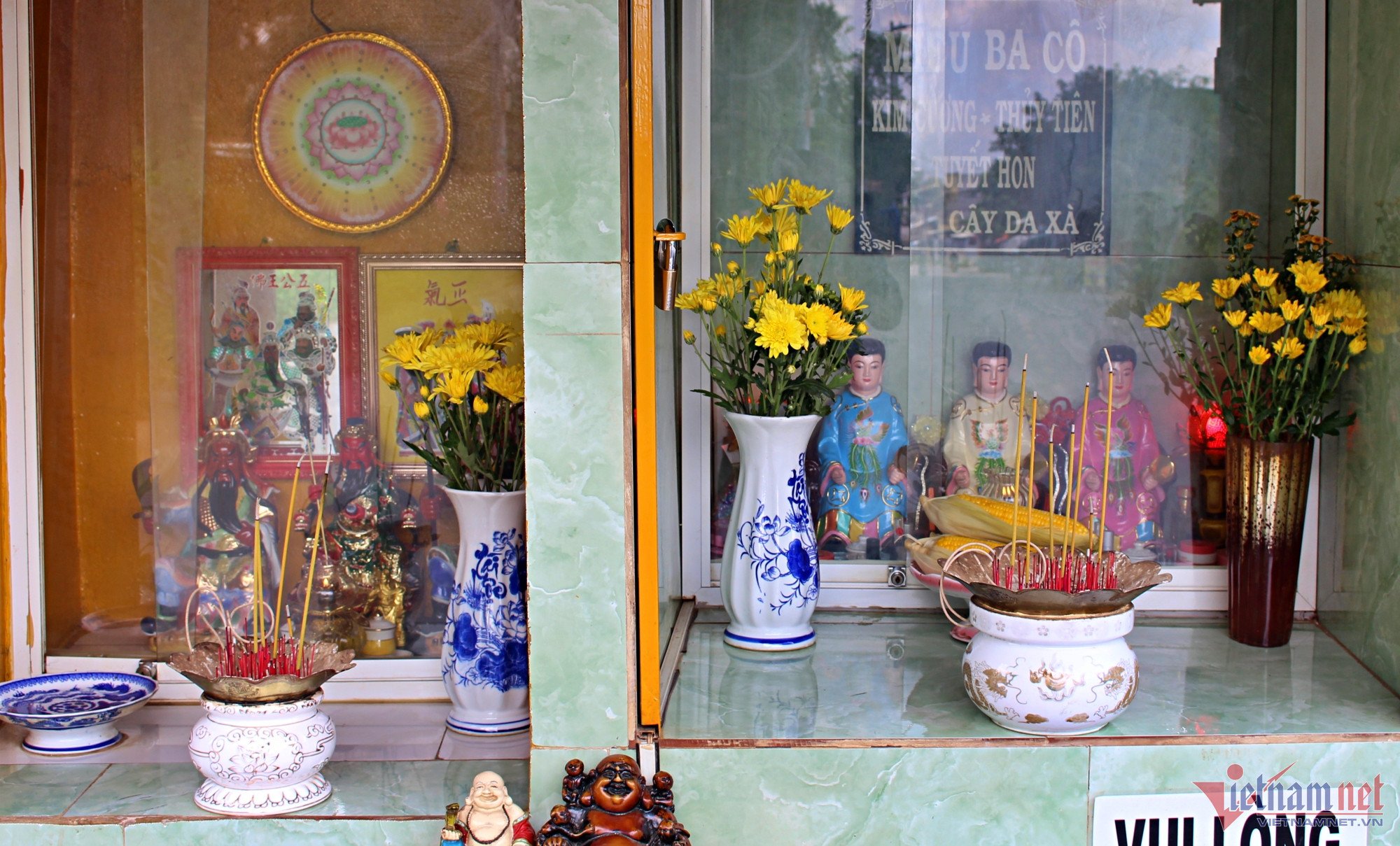 Sau khi mai táng, người thân các cô gái thỉnh 3 pho tượng bằng thạch cao về thờ trong miếu. Phía sau hương án, họ ghi rõ tên của 3 cô.