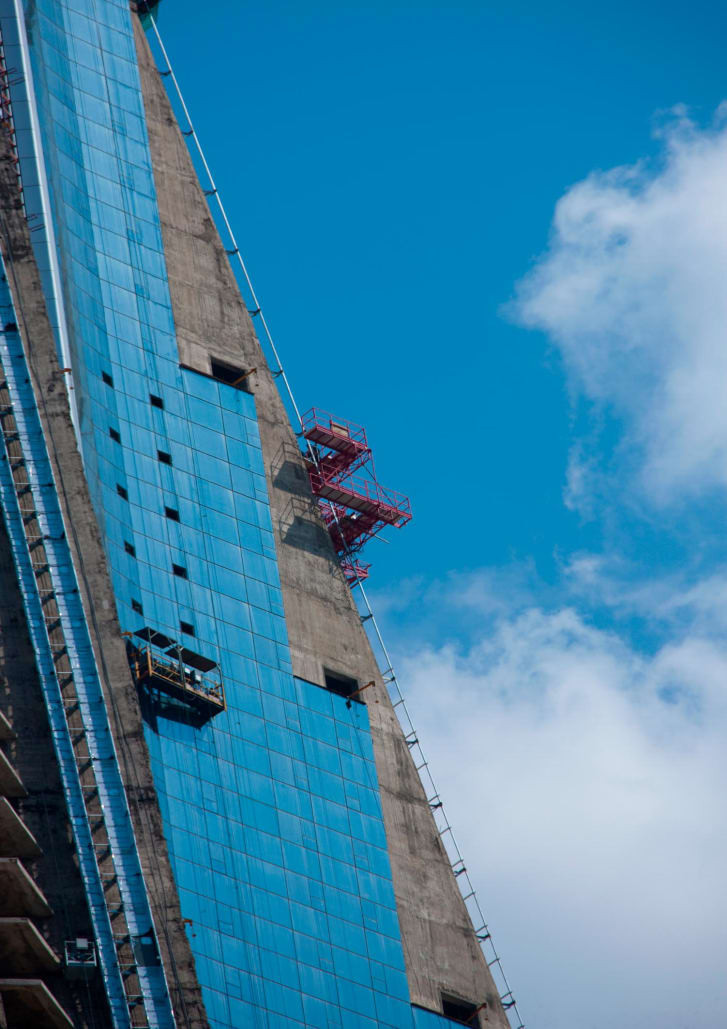Sau này, công trình tiếp tục được ốp bằng kim loại, kính và lắp thêm đèn LED để chiếu sáng vào ban đêm. Tiến trình xây dựng bị trì hoãn nhiều lần, làm dấy lên những đồn đoán về việc liệu nó có thể mở cửa đón khách hay không.