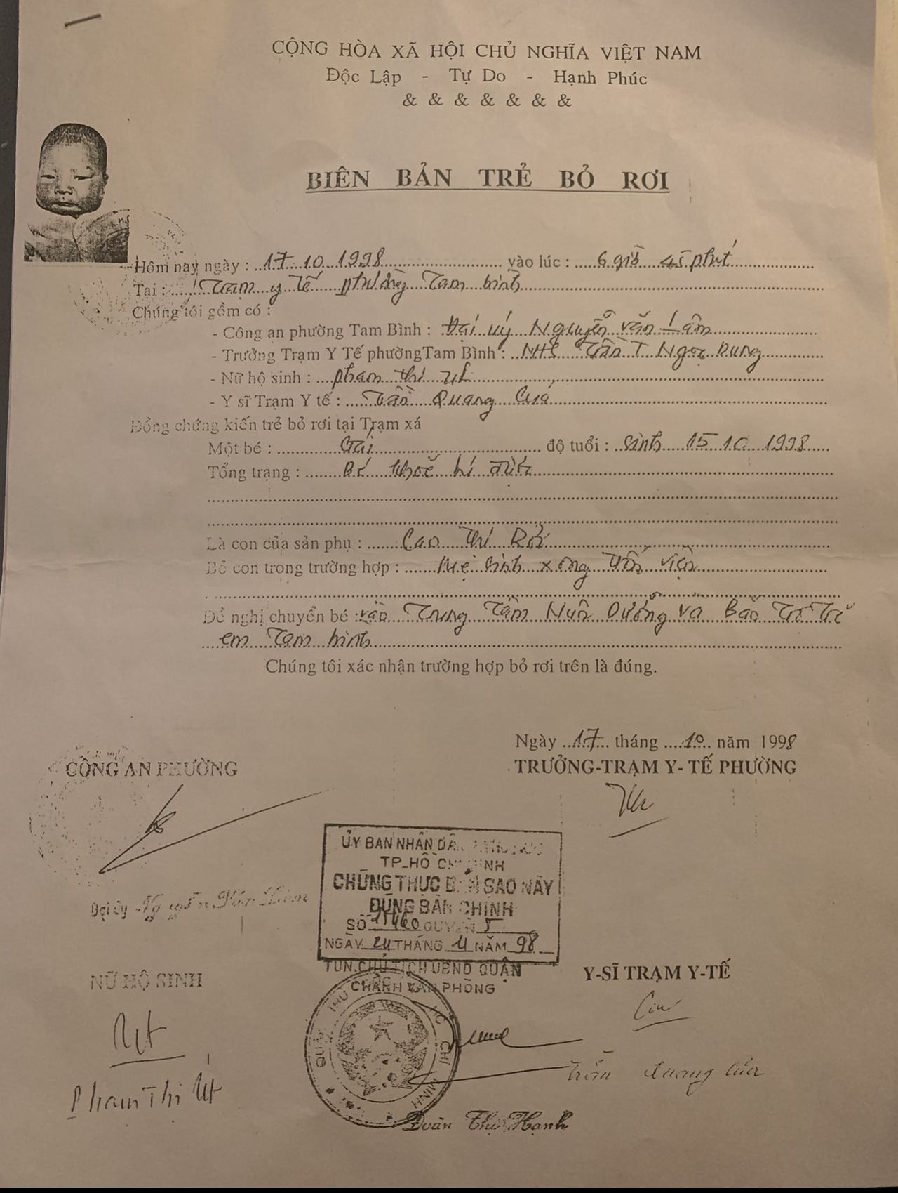 Laetitia cũng tìm được biên bản trẻ bỏ rơi ghi lại trường hợp của mình. Biên bản này ghi rõ ngày 17/10/1998, Đại úy Nguyễn Văn Lâm, Công an khu phố Tam Bình, bà Cao T. Ngọc Dung, Trưởng trạm Y tế Tam Bình; nữ hộ sinh tên Phạm Thị Út và bác sĩ tại trạm y tế tên Trần Quang Của đồng chứng kiến việc bé gái bị bỏ rơi.