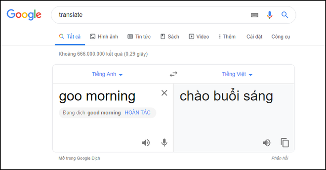 Nhiều trường hợp gõ sai thông thường nhưng Google sẽa tự nhận biết được và vẫn dịch chuẩn đích.