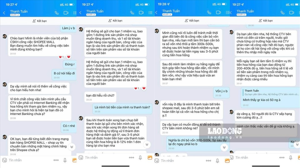 Sau đó H có nhắn tin cho nhà tuyển dụng để tìm hiểu về công việc thì được biết nhiệm vụ là đặt các đơn hàng ảo trên một số sàn thương mại điện tử để thu hút người mua hàng.