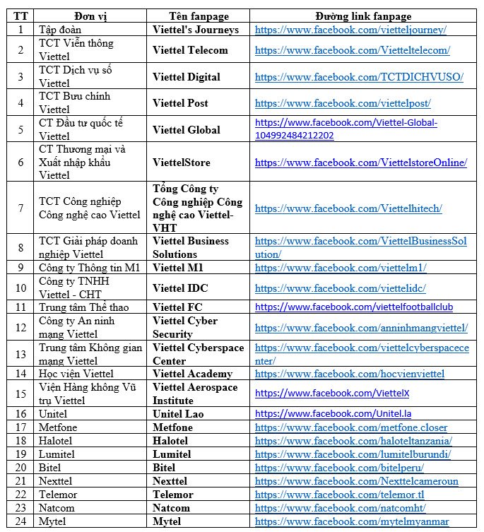 Danh sách các fanpage chính thức của Viettel đã đăng ký: