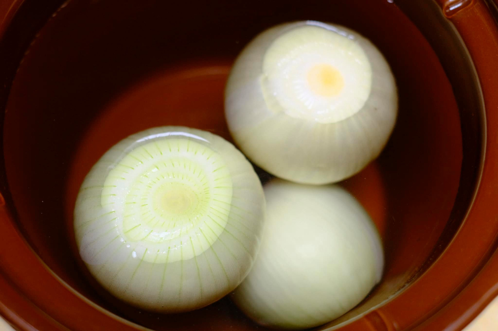 Nếu nhà bạn không có nồi nấu chậm, hãy lấy 1 cái nồi đất hoặc nồi nào có khả năng giữ nhiệt tốt, cho 3 củ hành vào và đổ nước xâm xấp. Nấu sôi, xong đậy nắp thật kín và để tới sáng là đủ.
