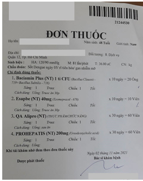 Cụ thể, trên đơn thuốc ghi nội dung chẩn đoán: "sốt xuất huyết Dengue ngày 5/rl tiêu hóa/gan nhiễm mỡ". Bốn loại thuốc bác sĩ kê gồm: Baciamin Plus (NT) 1 tỉ CFU, Esaphe (NT) 40mg, QA Alipro (NT), Prohepatis (NT), uống từ 10-30 ngày với giá hơn 2 triệu đồng. Trong đó, QA Alipro (NT) là thực phẩm chức năng, các thuốc còn lại không điều trị sốt xuất huyết.