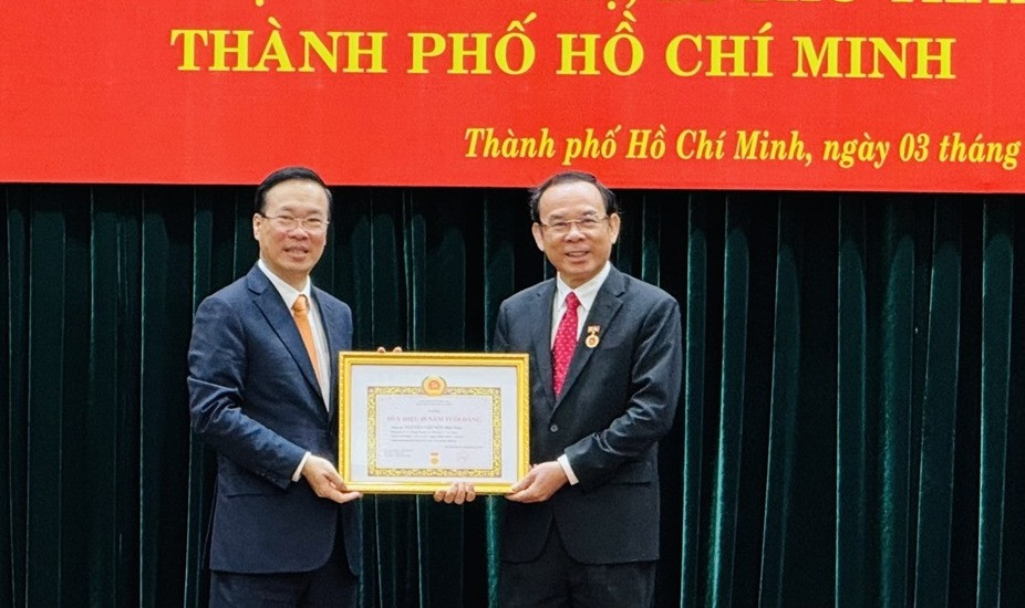 Chủ tịch nước Võ Văn Thưởng dự và trao Huy hiệu 45 năm tuổi Đảng cho Bí thư Thành ủy TP.HCM Nguyễn Văn Nên.