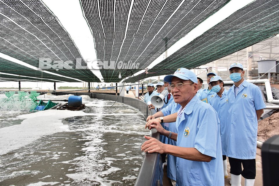 Đồng chí Lữ Văn Hùng - Bí thư Tỉnh ủy tham quan khu nuôi tôm ứng dụng công nghệ cao của Công ty cổ phần Việt - Úc Nhà Mát. Ảnh: H.T