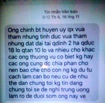 Nội dung tin nhắn nói là lãnh đạo huyện ngủ với một nữ cán bộ mới được bổ nhiệm làm việc tại huyện và nhiều thông tin khác liên quan đến đất đai.