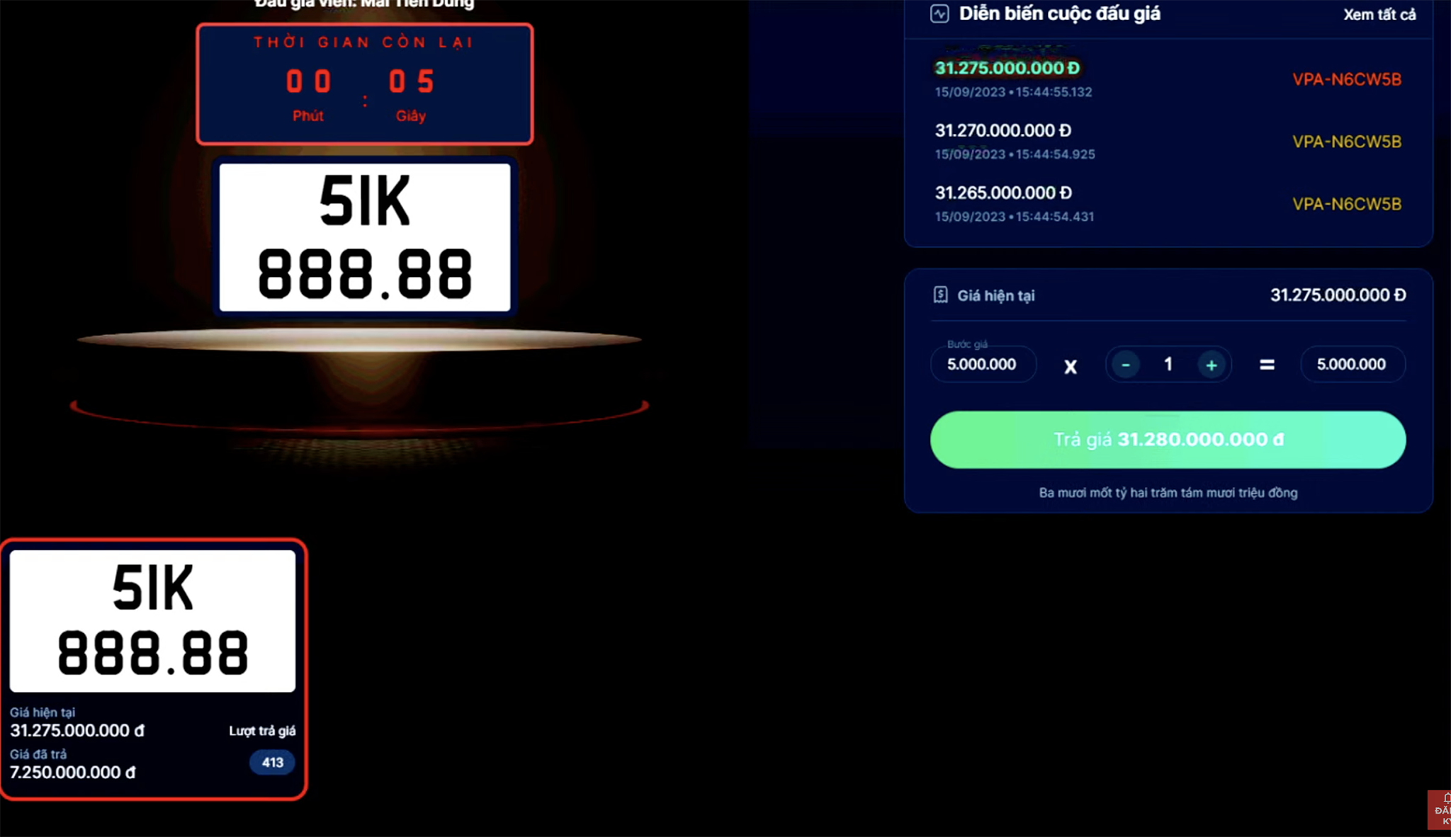 Thời điểm chỉ còn hơn 1 phút cuối, có người trả 31,150 tỷ đồng cho biển số "ngũ quý 8" này. Càng những giây cuối, giá của biển số xe được trả càng nhanh, người cuối cùng trả giá được ghi nhận là 32,340 tỷ đồng.