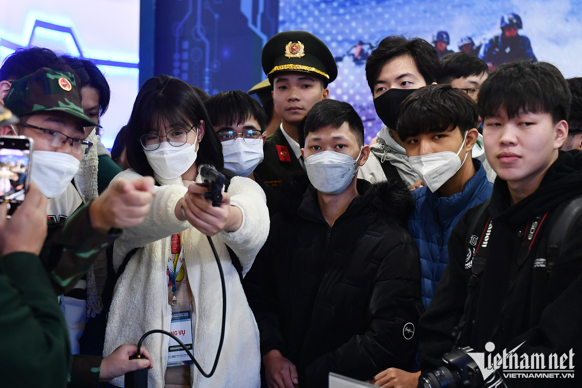 Nơi trưng bày súng áp chế thiết bị bay (flycam) cũng thu hút khách. Nhiều bạn trẻ cầm nâng thử để chụp ảnh và được cán bộ trông coi vui vẻ cầm điện thoại bấm giúp.