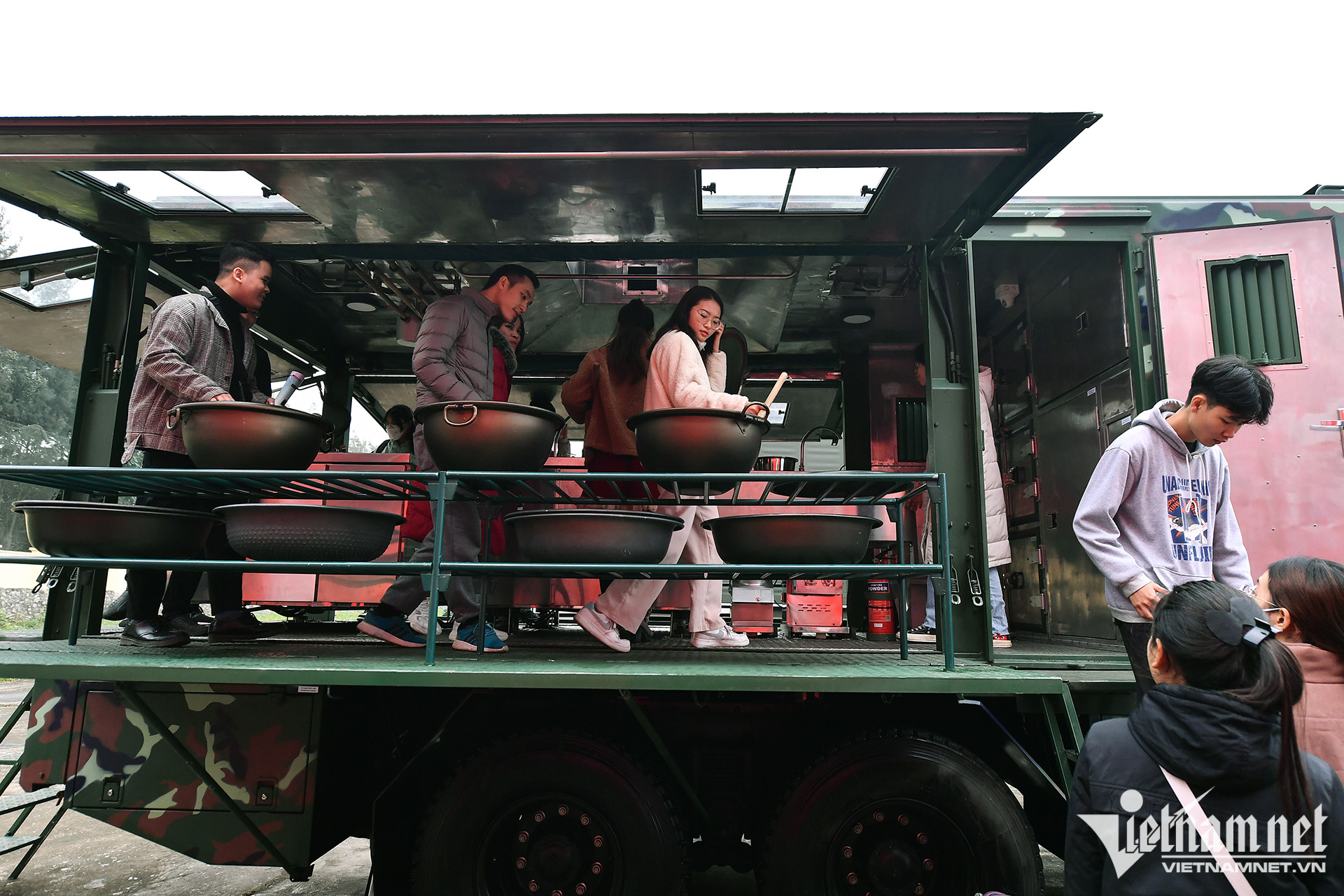 Nhiều người thay nhau trèo lên chiếc xe bếp tự hành để tham quan khu vực nấu nướng.