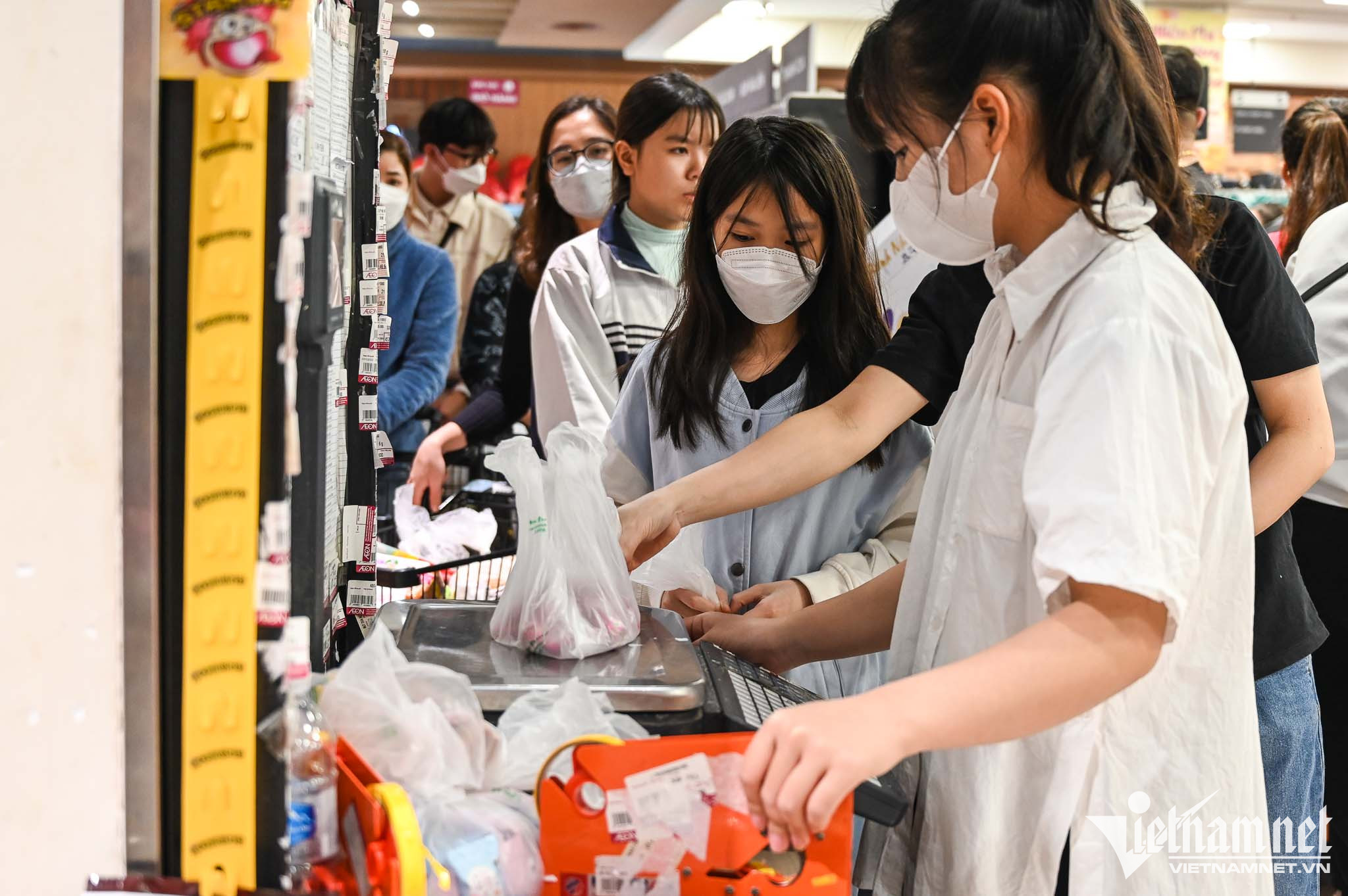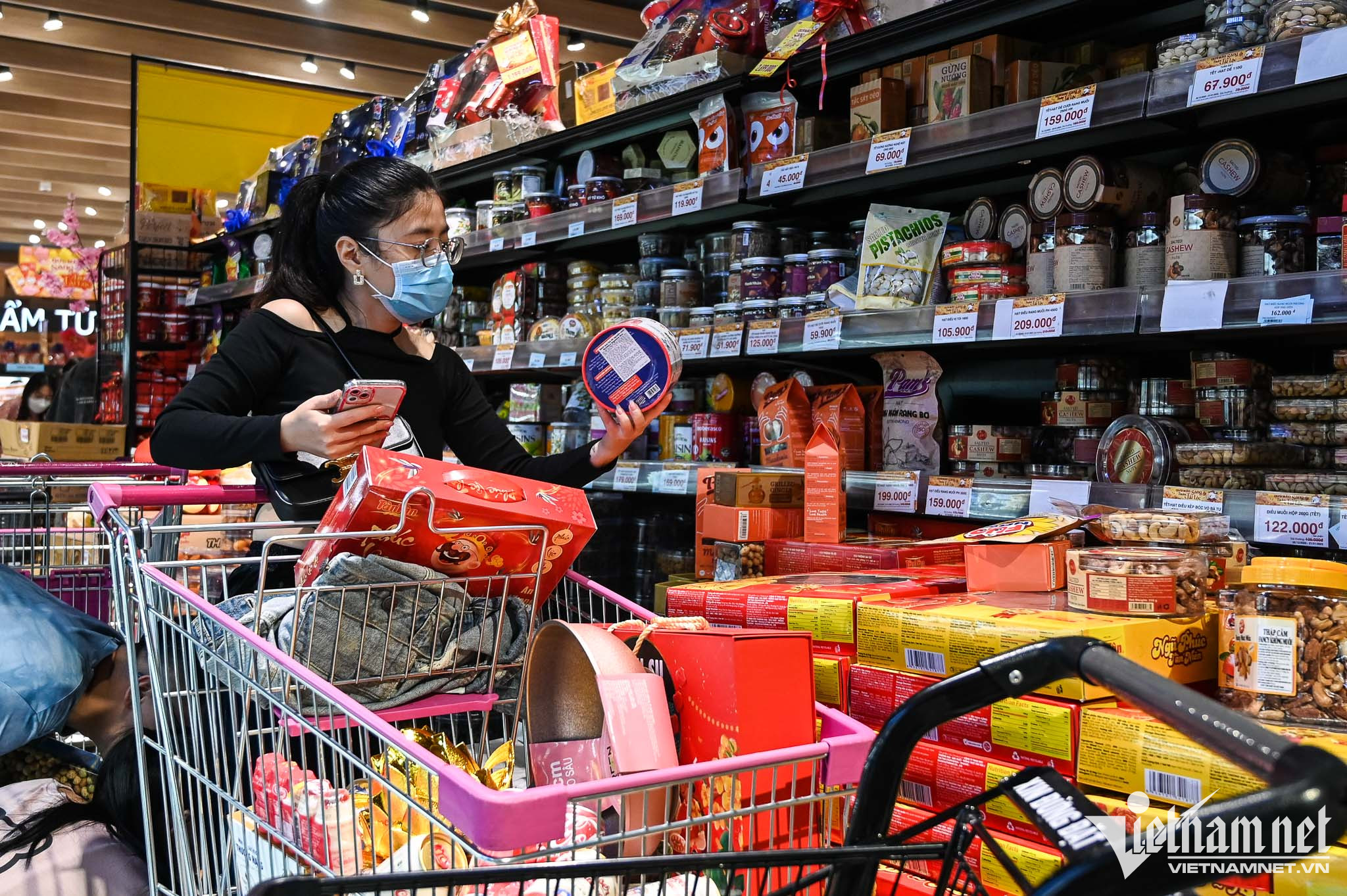 Lối đi giữa các kệ cũng chật kín khách, đặc biệt là khu vực bày hàng thực phẩm, đồ khô, bánh kẹo.