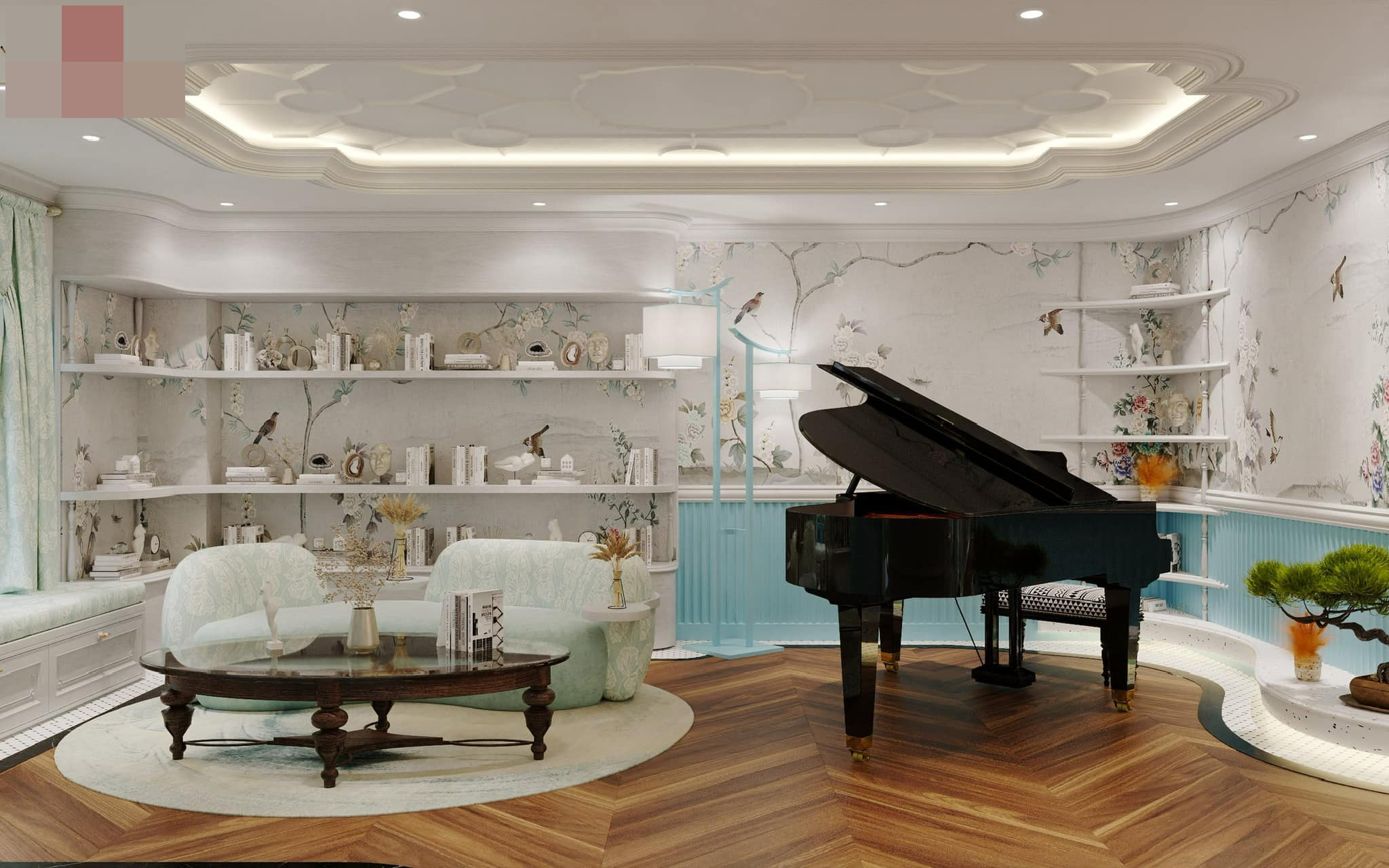 Khu vực trần thiết kế đẹp mắt, tinh tế. Nội thất có một chút vintage nên nhìn mềm mại. Giữa nhà được bố trí chiếc đàn piano lớn, vừa có tác dụng decor vừa là vật dụng cho gia chủ giải trí.