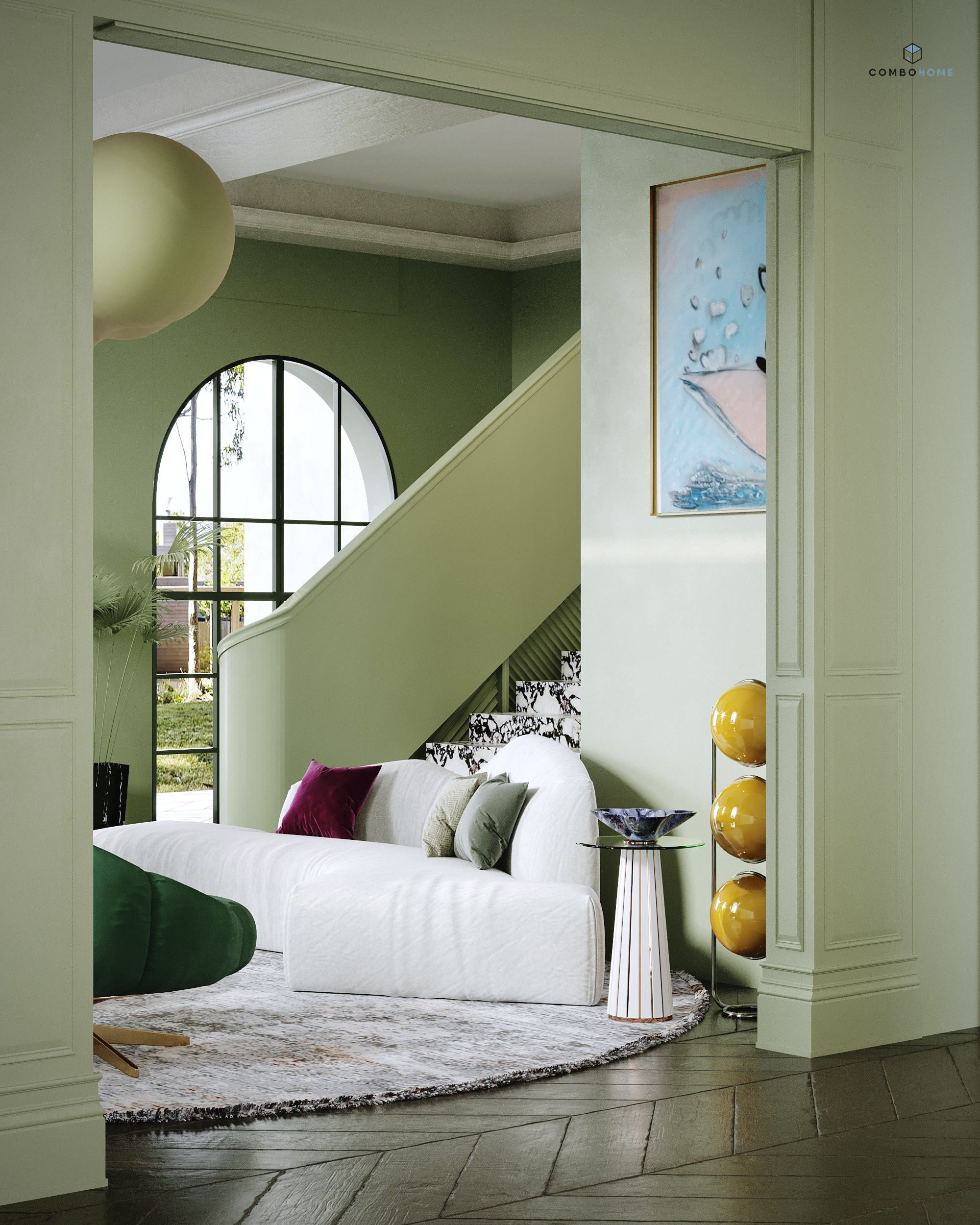 Tổng thể biệt thự có 3 khối nhà, mỗi khối mang màu sắc khác nhau như: Xanh cốm, cam đất, hồng.