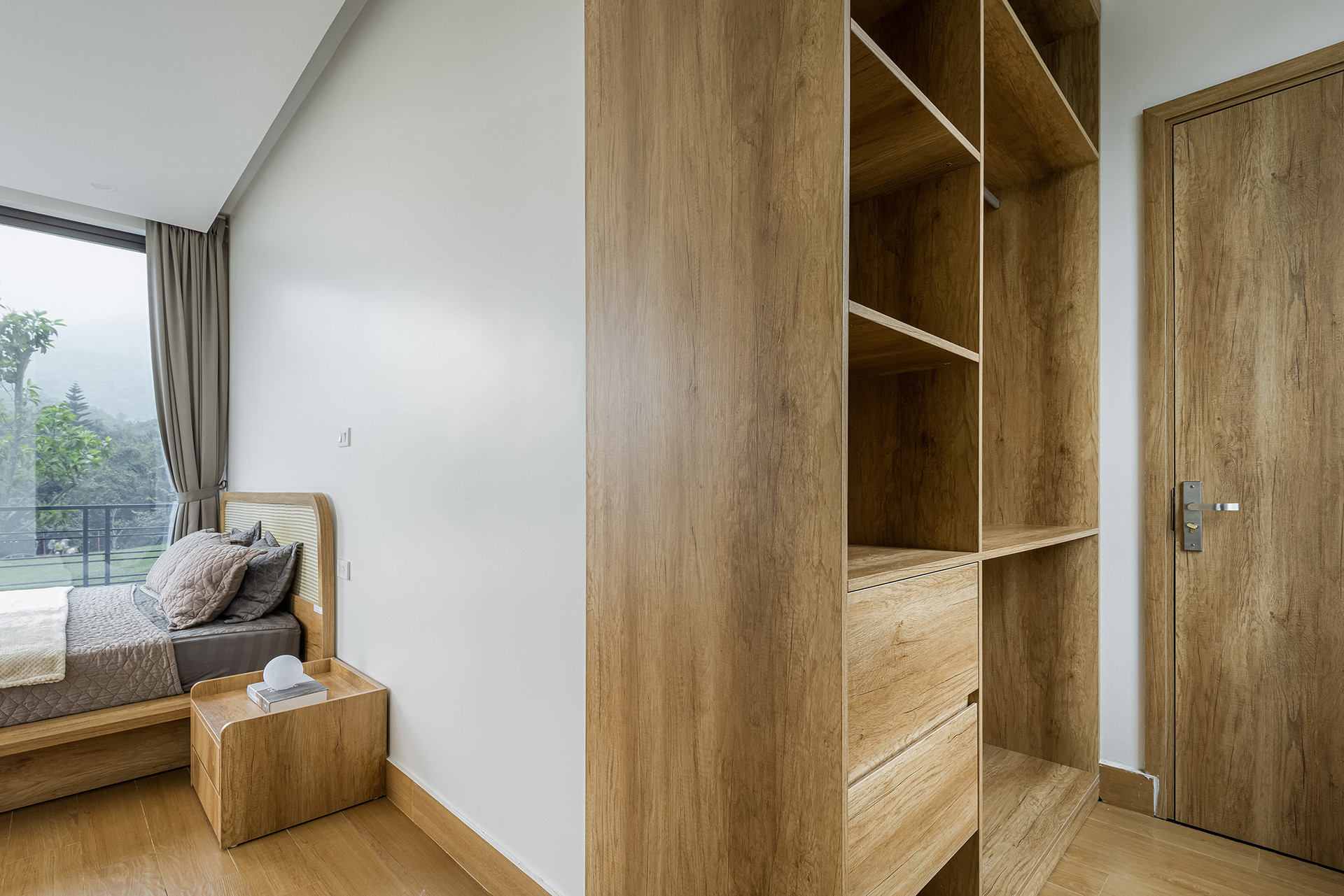 Kệ đựng đồ ngay lối cửa ra vào phòng ngủ, tận dụng tối đa các góc chết, tăng tiện ích cho không gian.