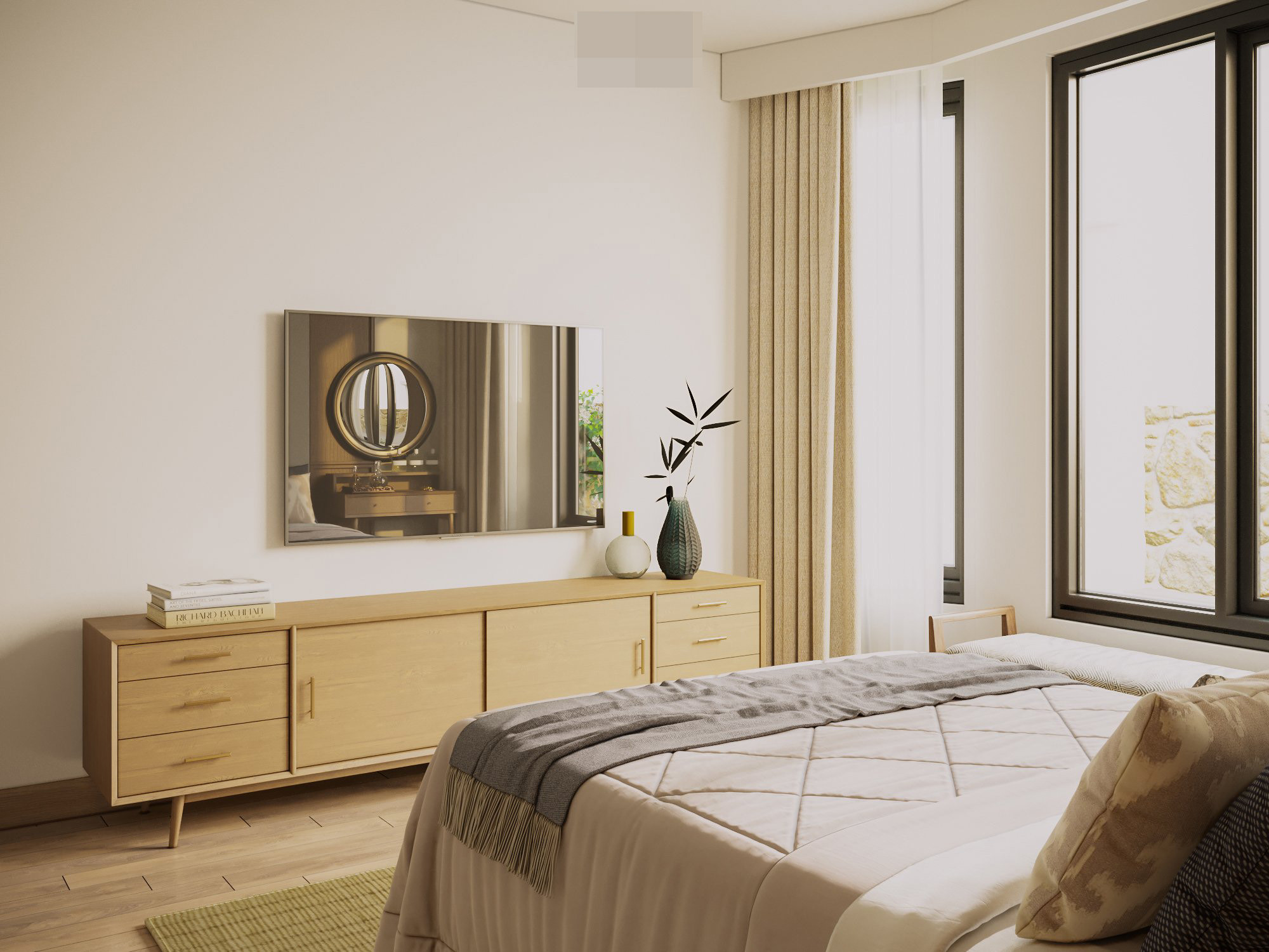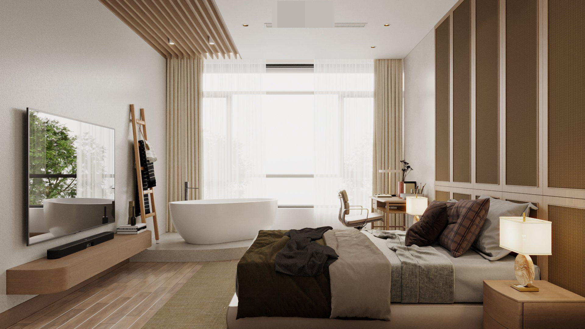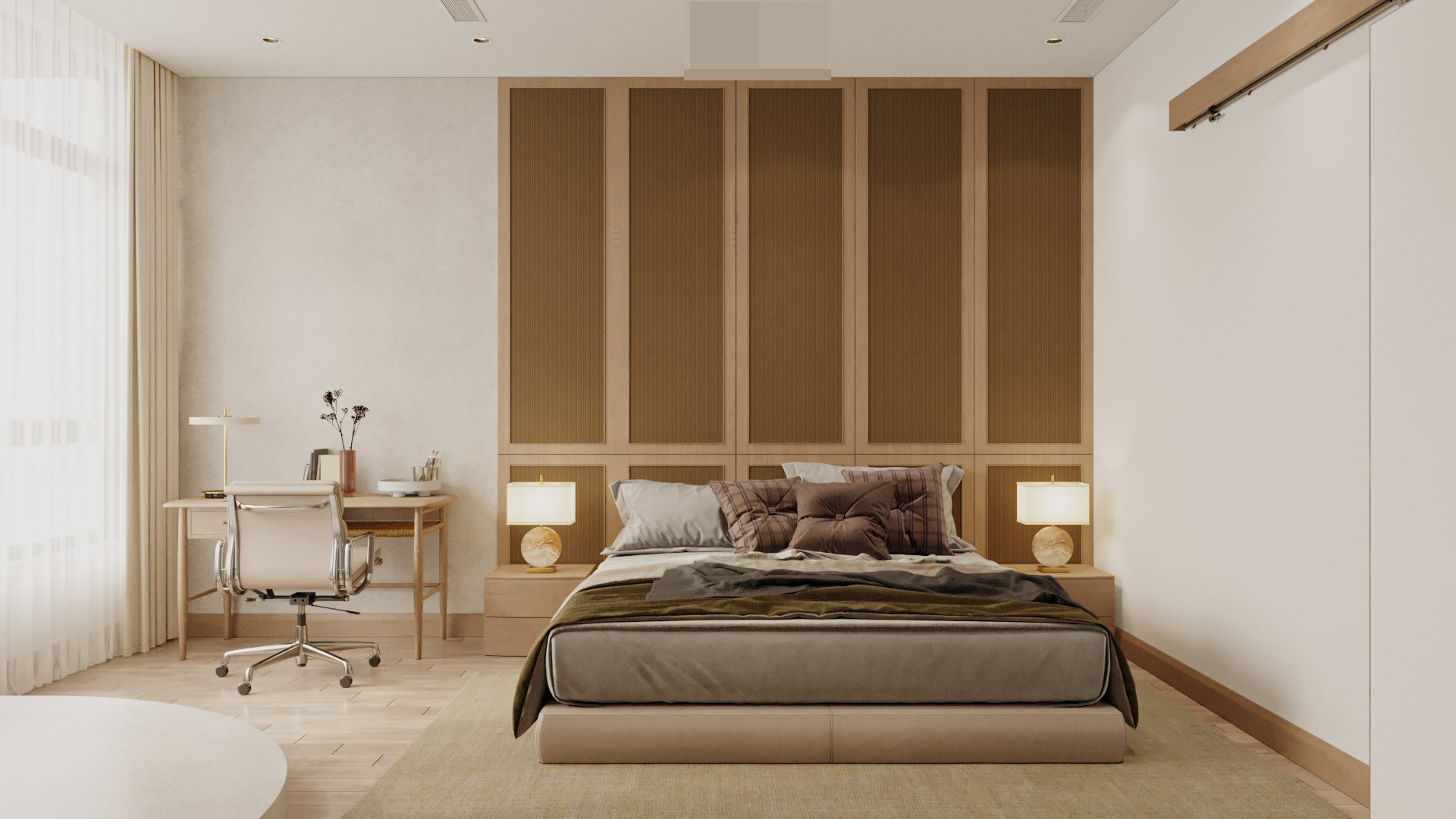 Sự kết hợp màu sắc trung tính, vật liệu tự nhiên làm nên vẻ đẹp của không gian phòng ngủ.