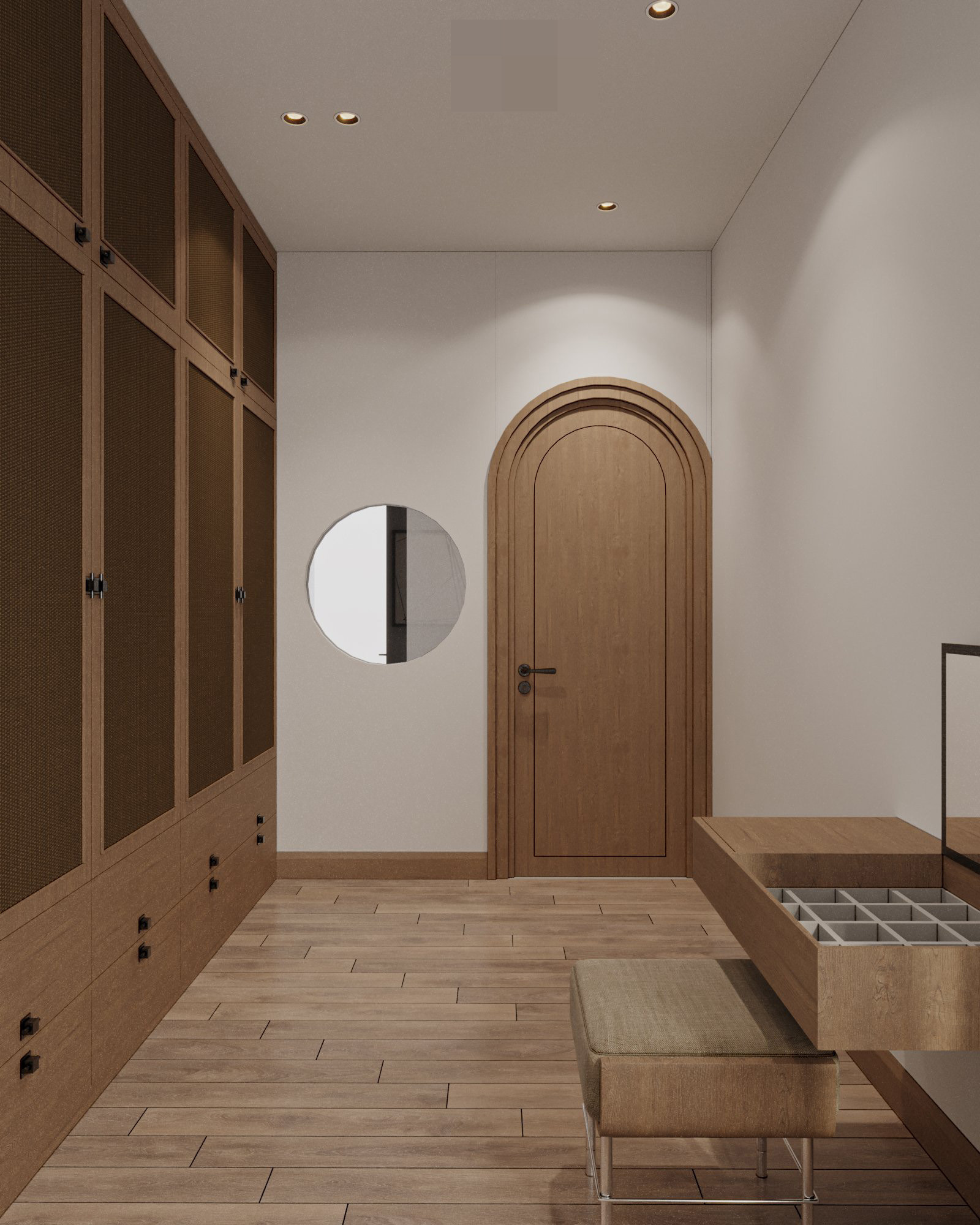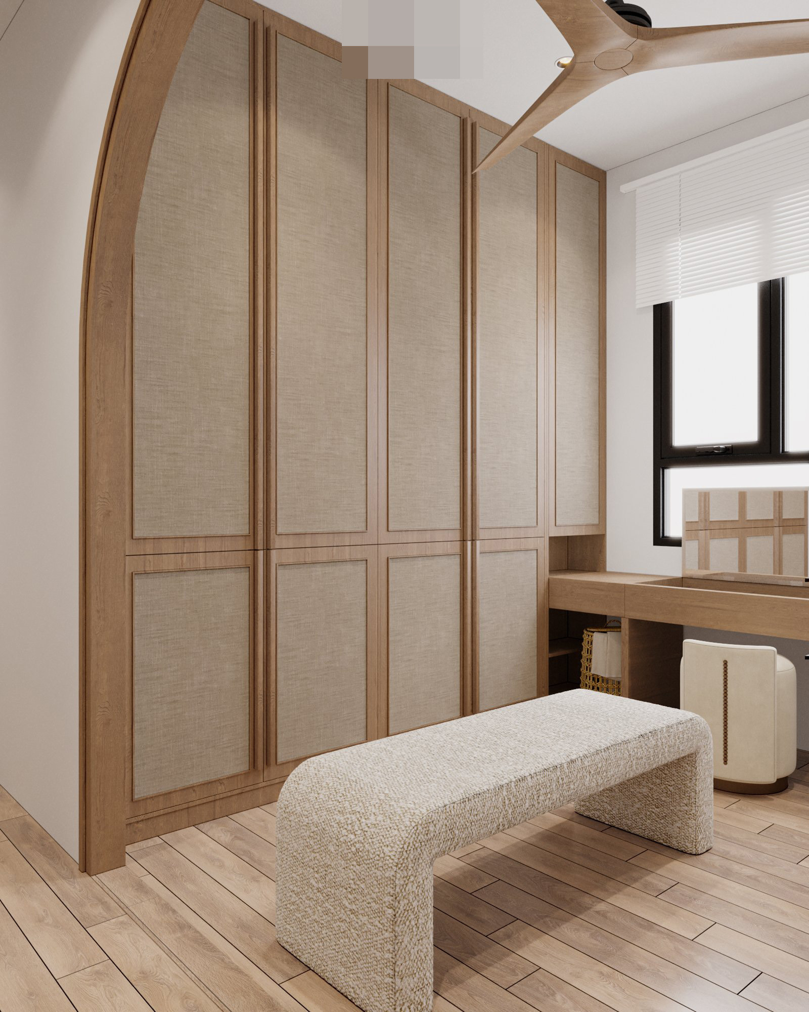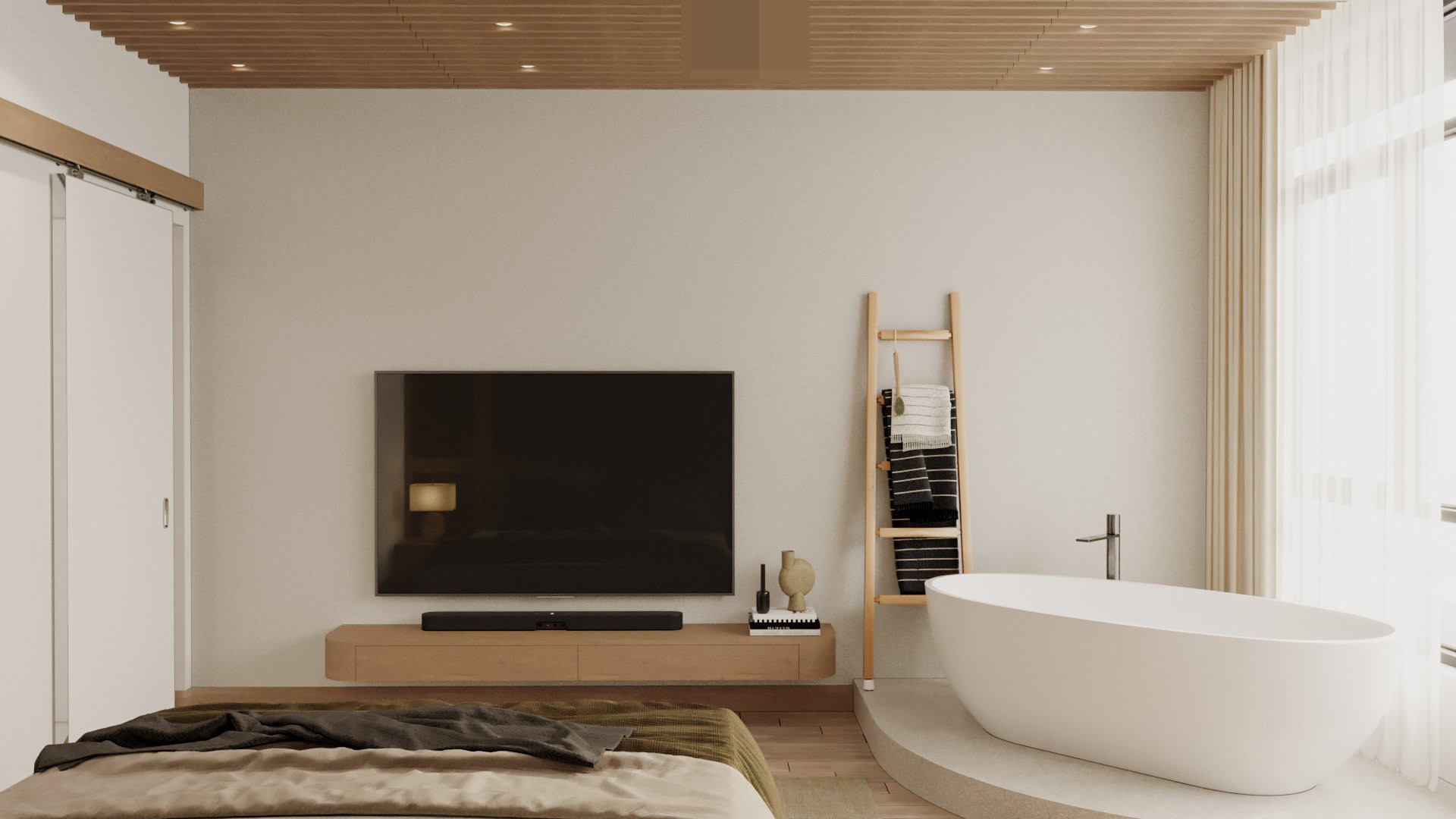Sự kết hợp màu sắc trung tính, vật liệu tự nhiên làm nên vẻ đẹp của không gian phòng ngủ.