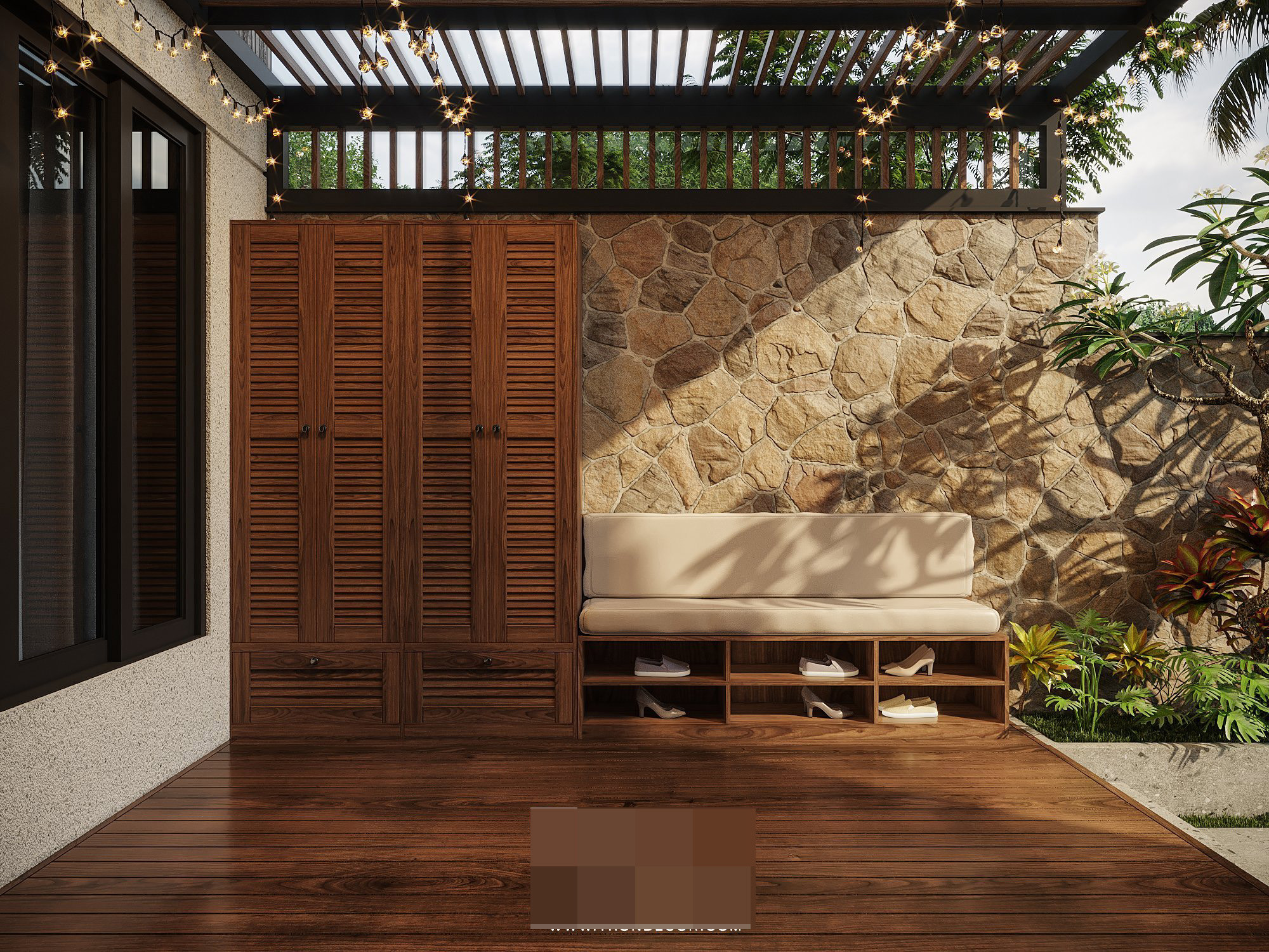 Mảng tường ở sân để xe và khu vực đệm trước khi vào nhà được ốp đá rối thể hiện vẻ đẹp thiên nhiên, hoang sơ và mộc mạc. Khu sân để xe thiết kế hệ tủ kho đựng đồ sửa chữa xe và các thiết bị hay sử dụng. Bên cạnh là chuồng cho thú cưng và bồn rửa tay bằng đá thô nhám, nguyên sơ. Còn tại khu tủ giày, kiến trúc sư thiết kế sàn gỗ sạch sẽ, tạo thành khoảng ngồi chơi khá thú vị.