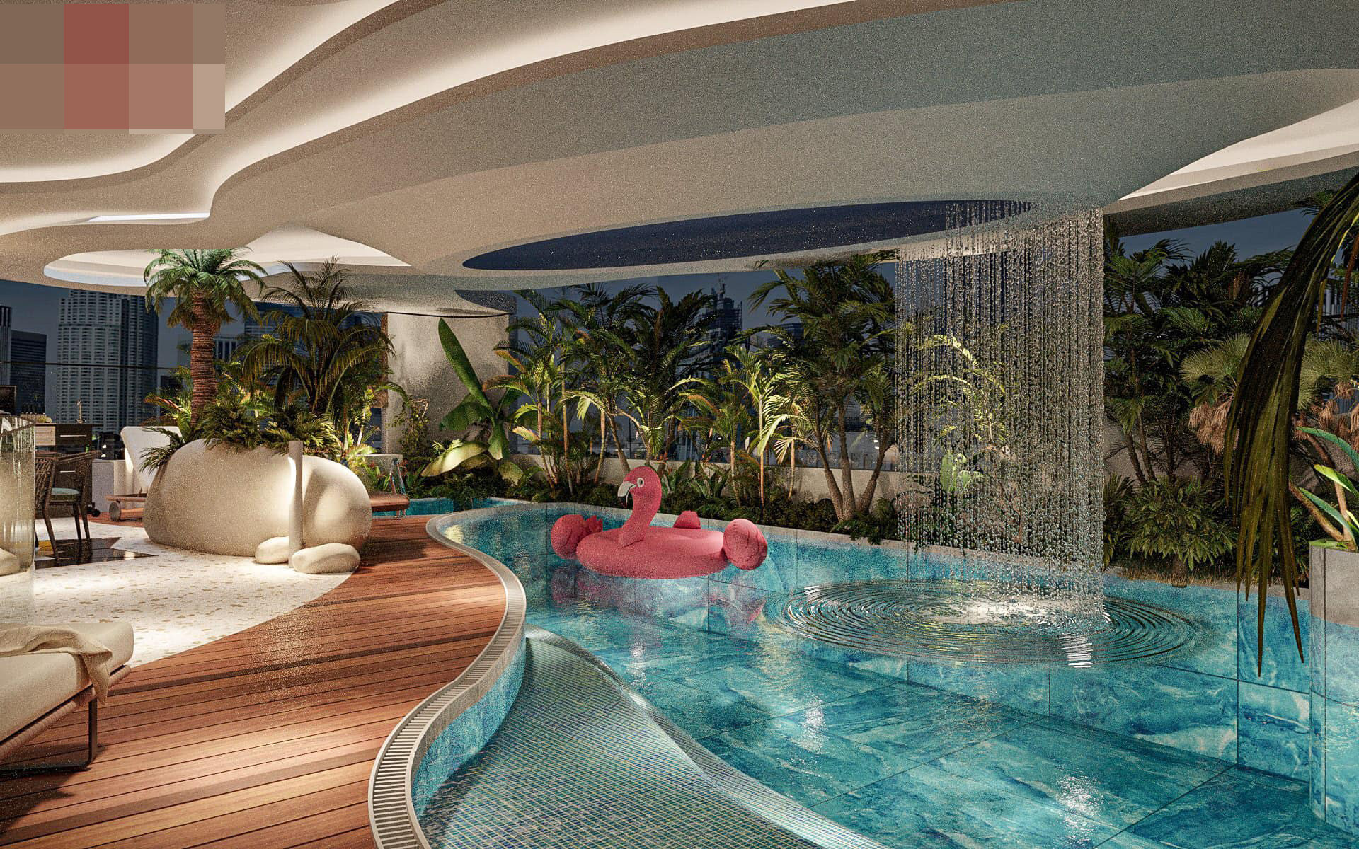 Bể bơi vô cực trên tầng áp mái, thác nước siêu thực, đổ xuống từ trần.