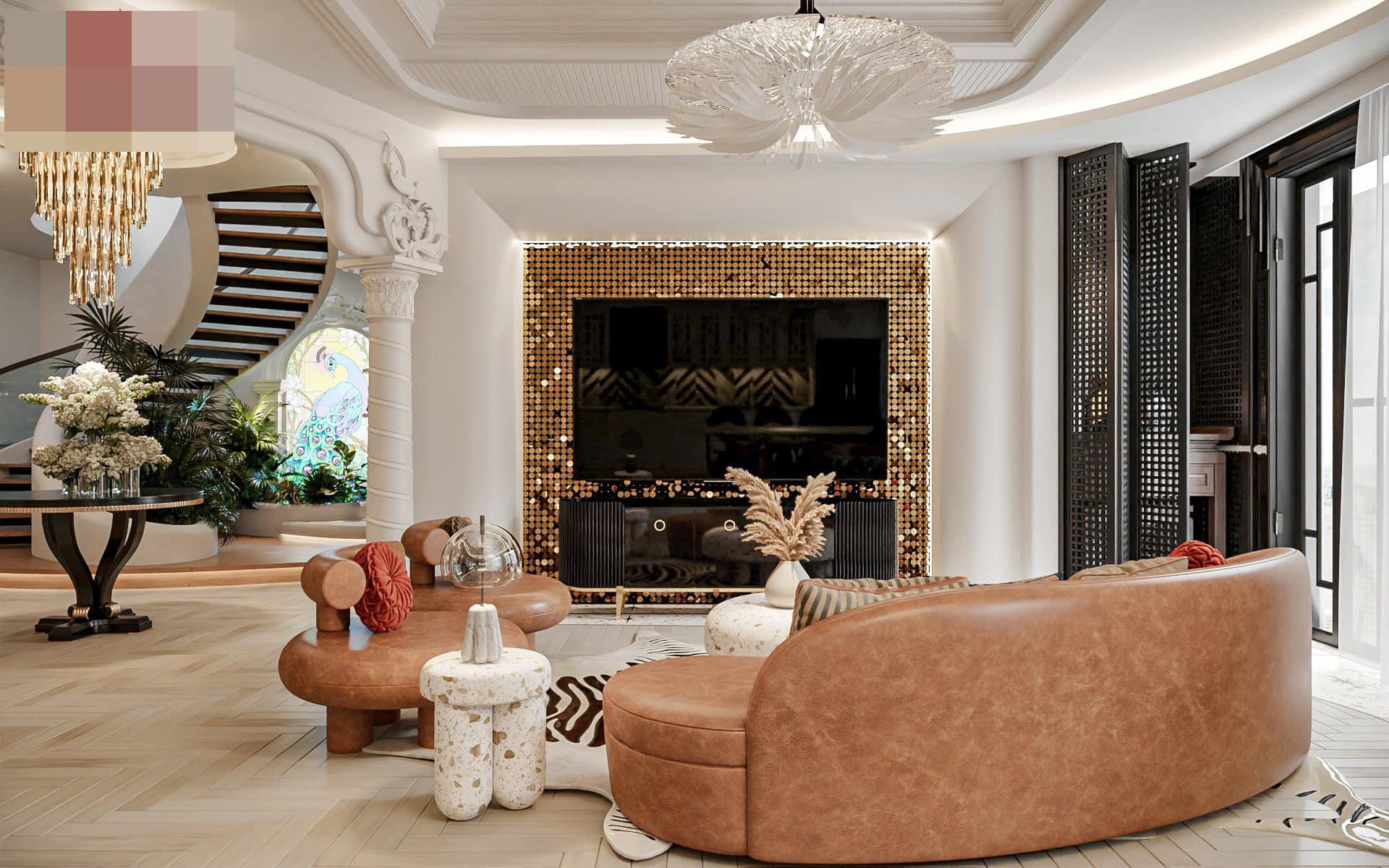 Phòng khách sang trọng, đẳng cấp với diện tích rộng, cho gia chủ tiếp đón bạn bè, người thân đến chơi thật thoải mái. Bộ sofa thiết kế riêng, độc lạ.