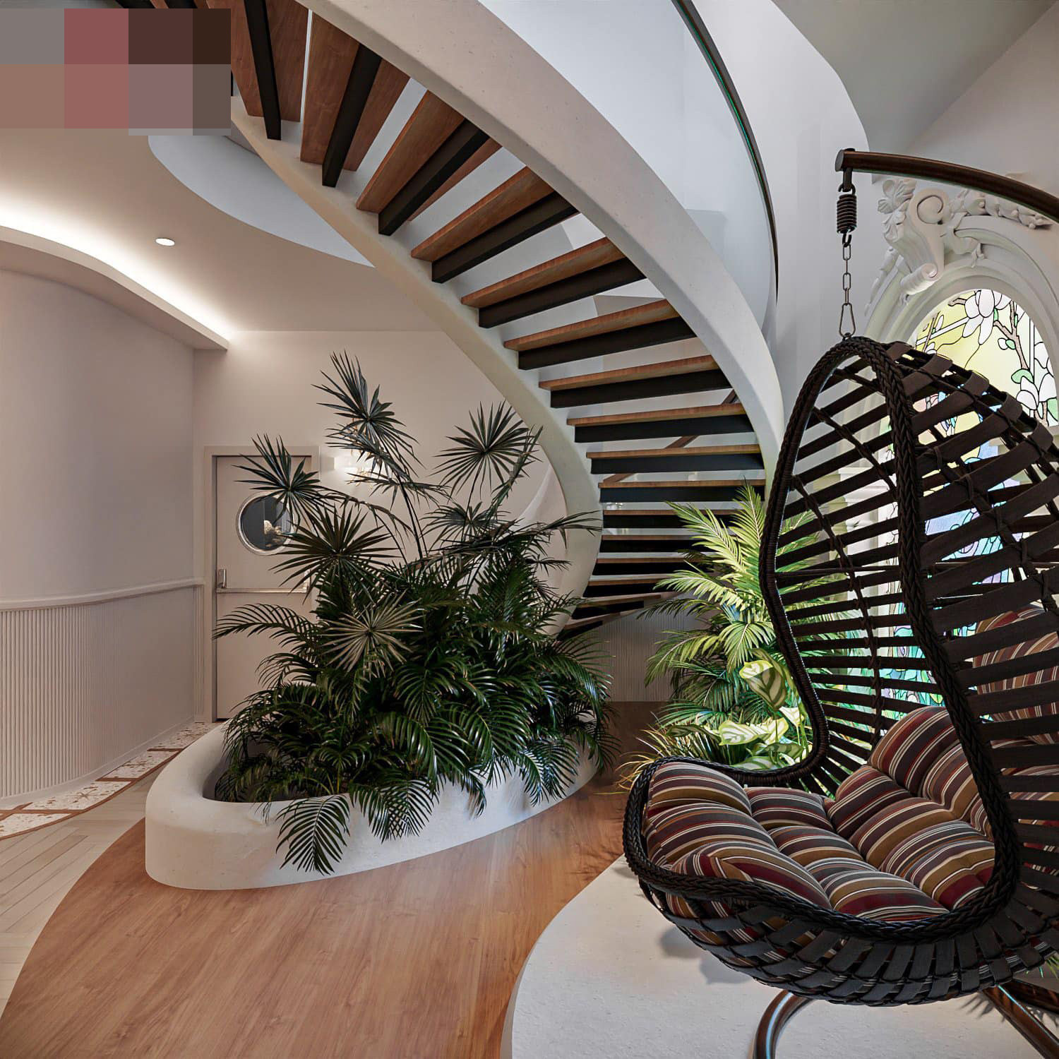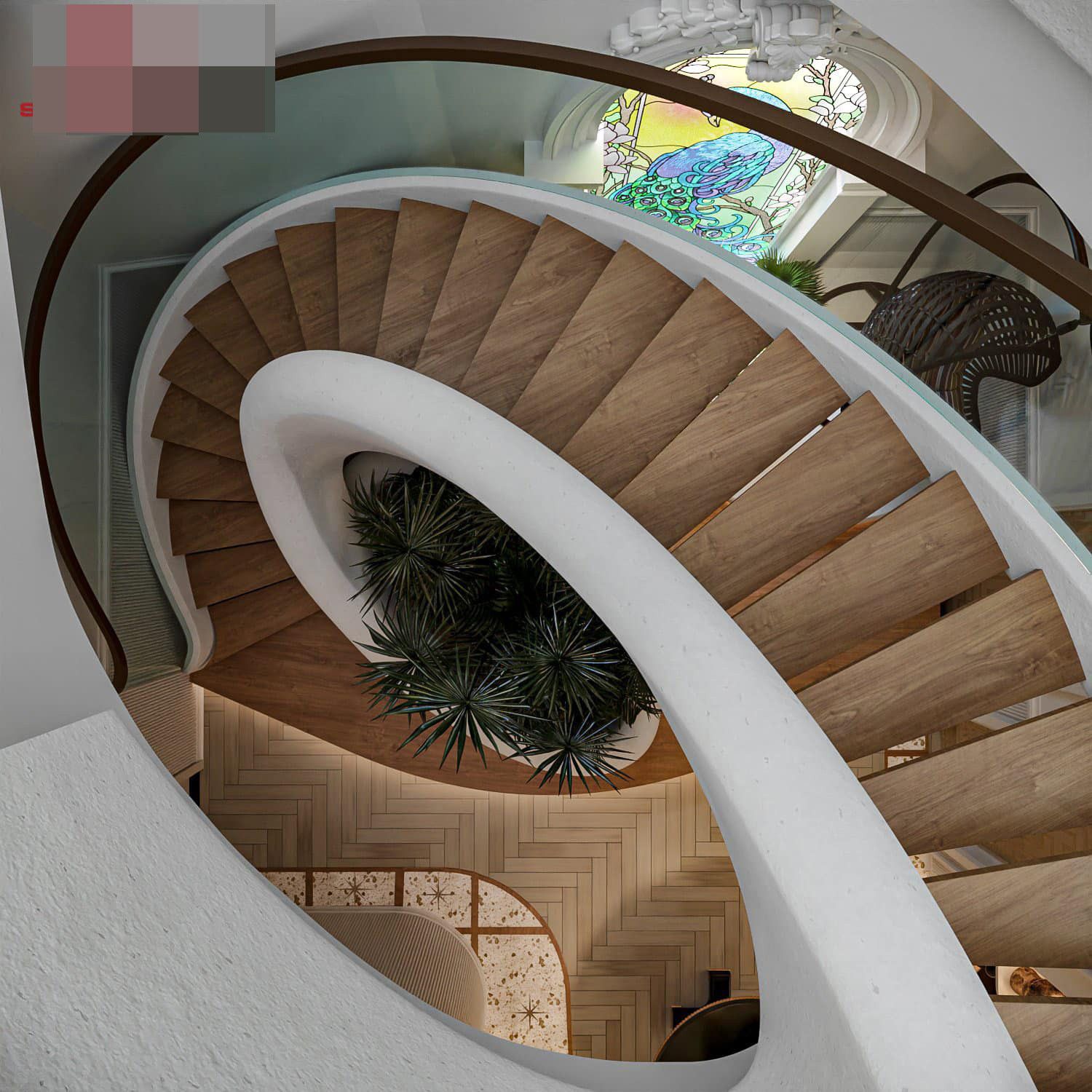 Cầu thang xoắn ốc, uốn lượn như những tầng mây bồng bềnh, mềm mại. Phía dưới là bồn cây nhỏ hút bụi bặm và giảm tiếng ồn, tạo sinh khí cho nhà.