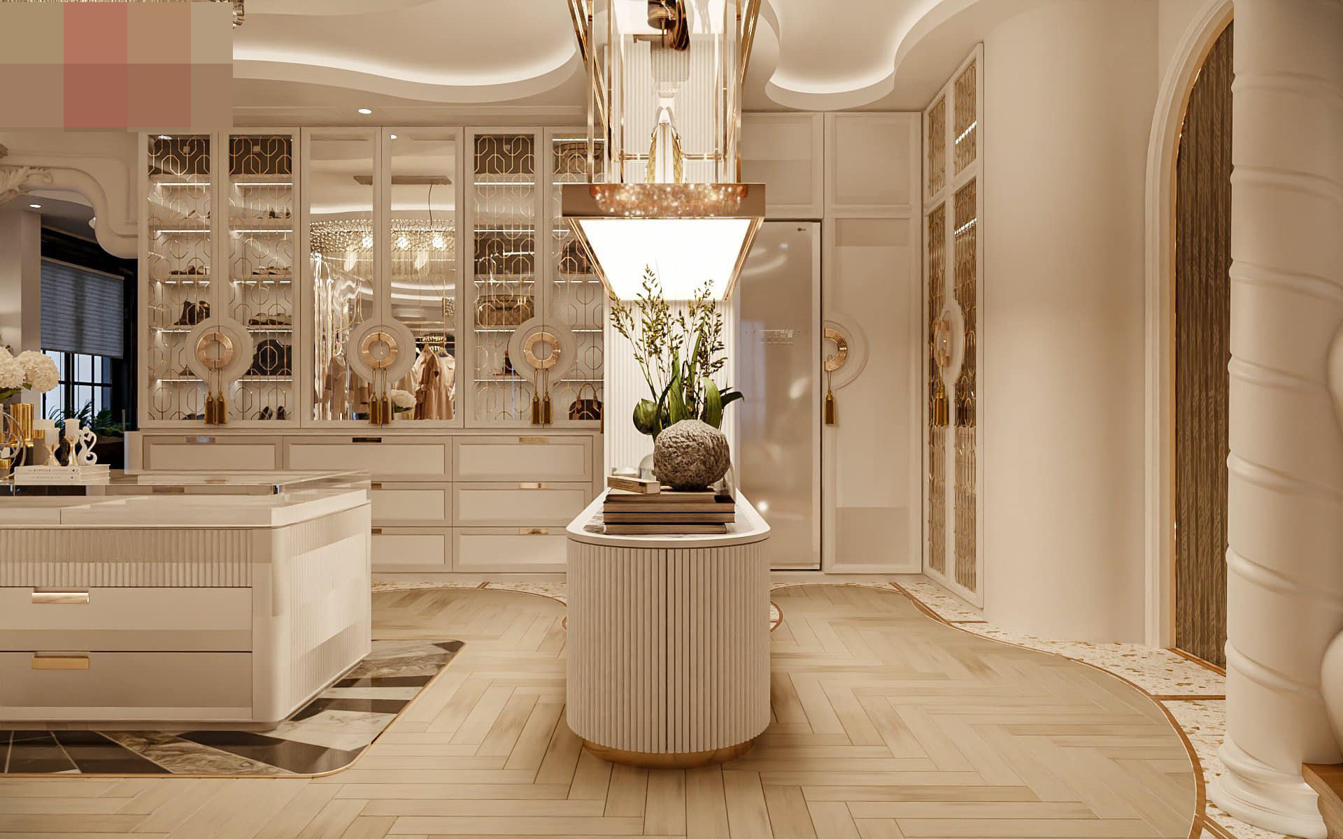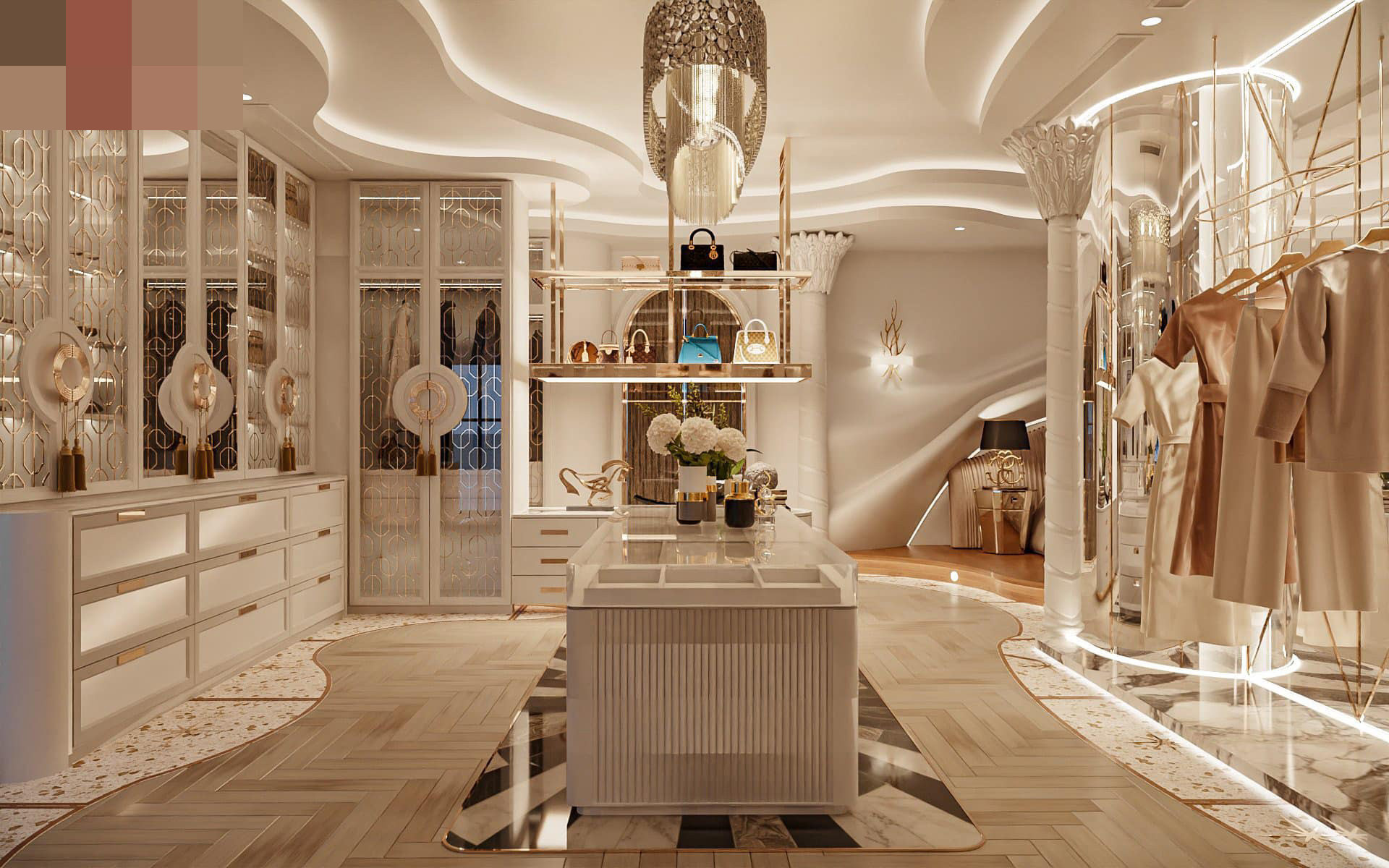 Phòng thay đồ siêu to, khổng lồ đáp ứng nhu cầu mua sắm, trưng bày đồ hiệu của nữ gia chủ.