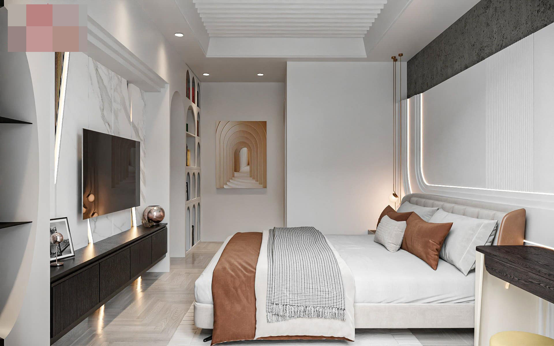 Phòng ngủ ấn tượng với mảng tường làm bằng chất liệu mềm mại, nhìn giống như dải lụa - tượng trưng cho lĩnh vực thời trang gia chủ đang kinh doanh. Phần giường trên hệ gỗ giật cấp với đèn chiếu gầm thẩm mỹ.