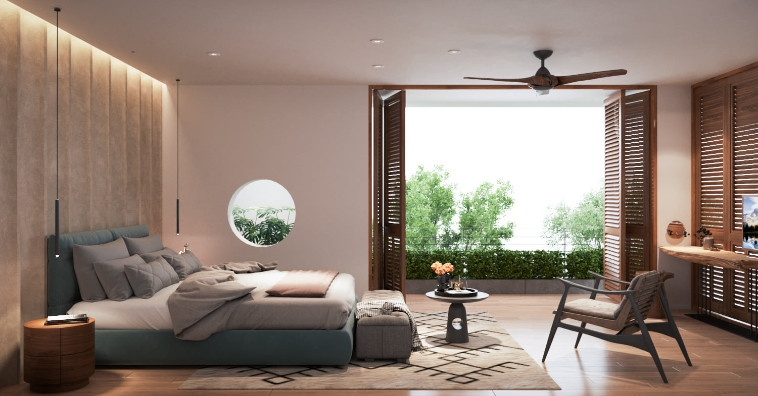 Phòng ngủ cho bố mẹ tiện nghi, sang trọng. Thiết kế mảng tường lượn sóng ở đầu giường lạ mắt.