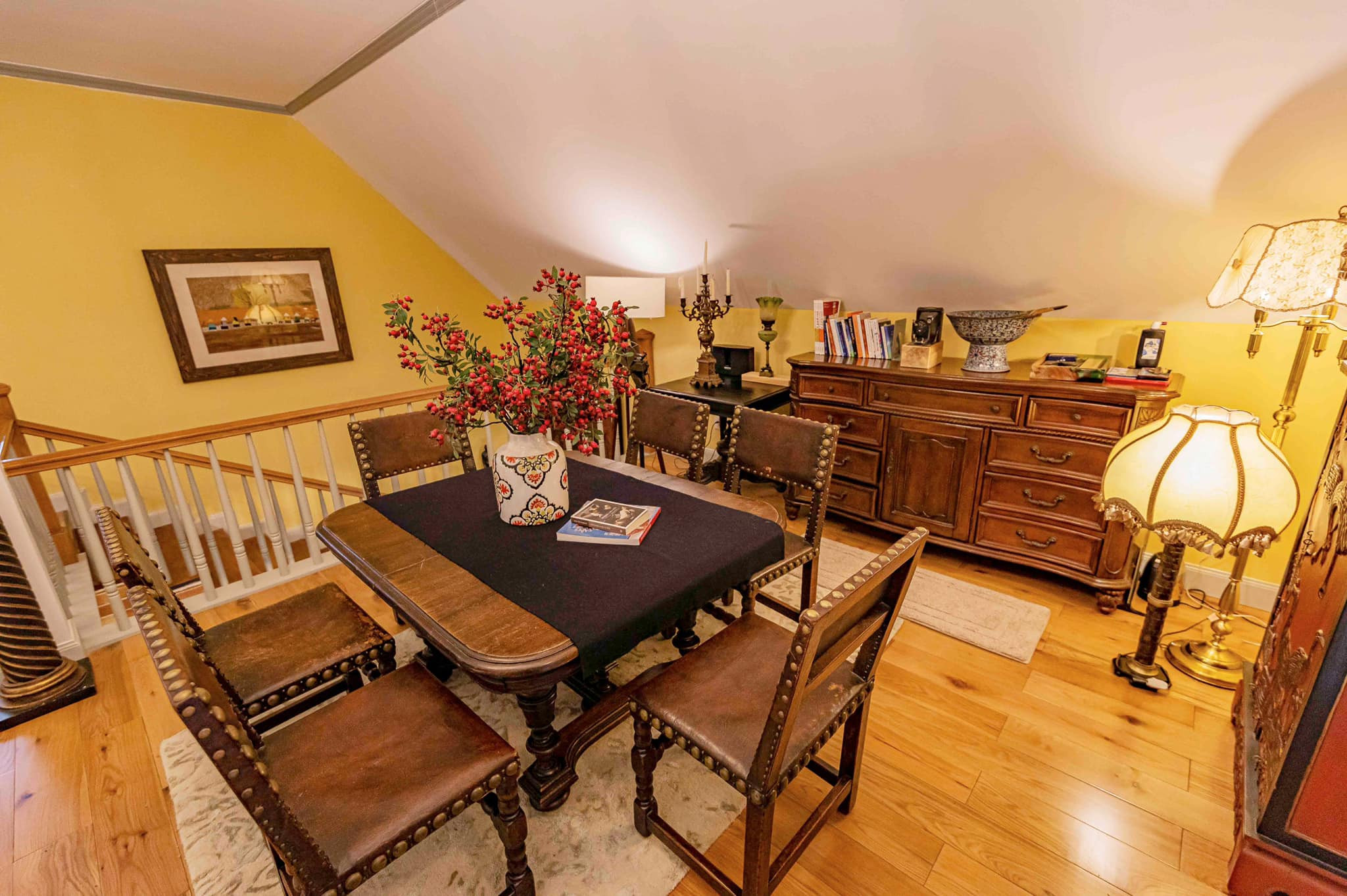 Lối lên tầng áp mái với cầu thang và lan can có tay vịn bằng gỗ, gợi nhớ mùa đông tuyết trắng châu Âu.