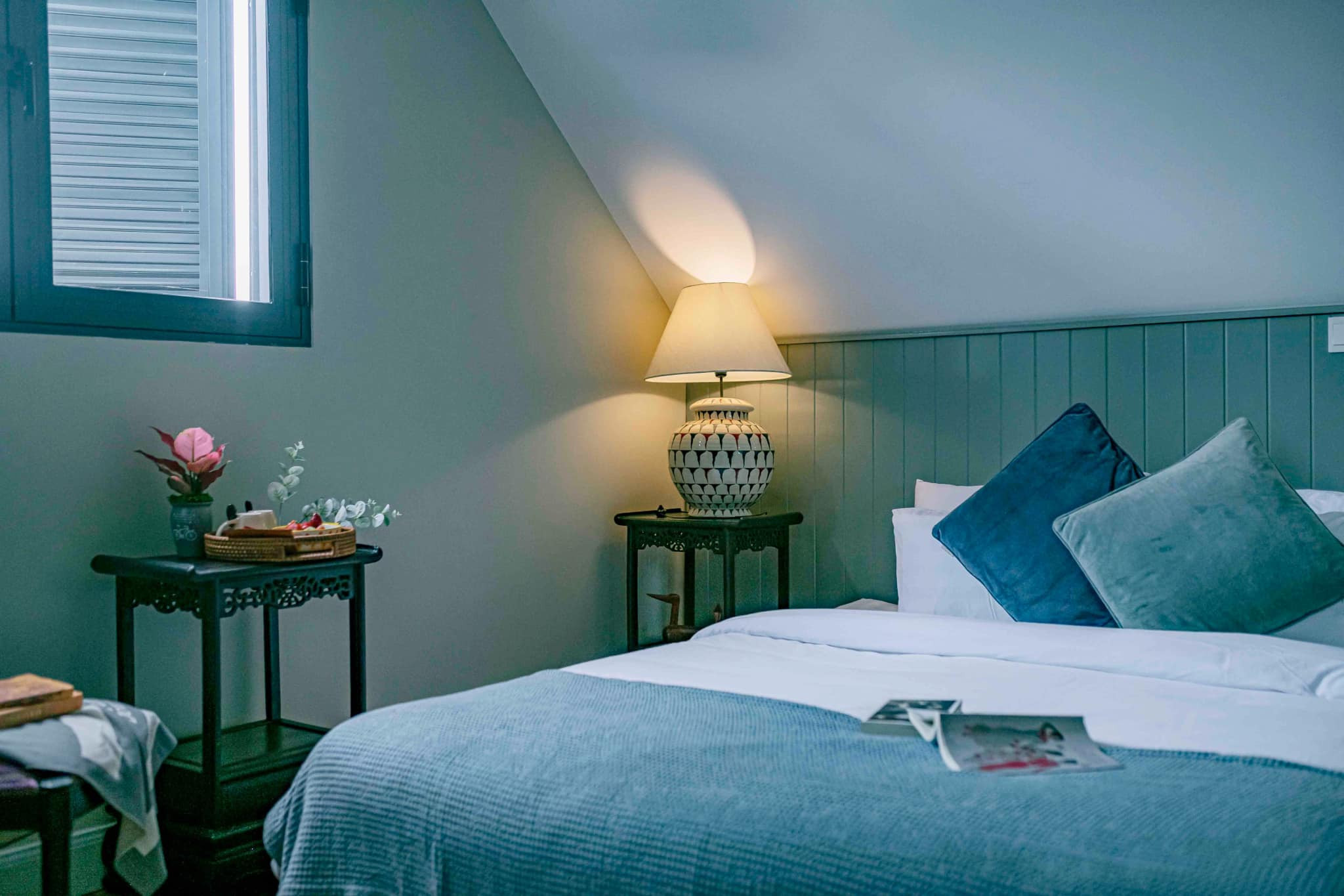 Phòng ngủ sử dụng gam màu xanh pastel dịu dàng, dễ chịu.