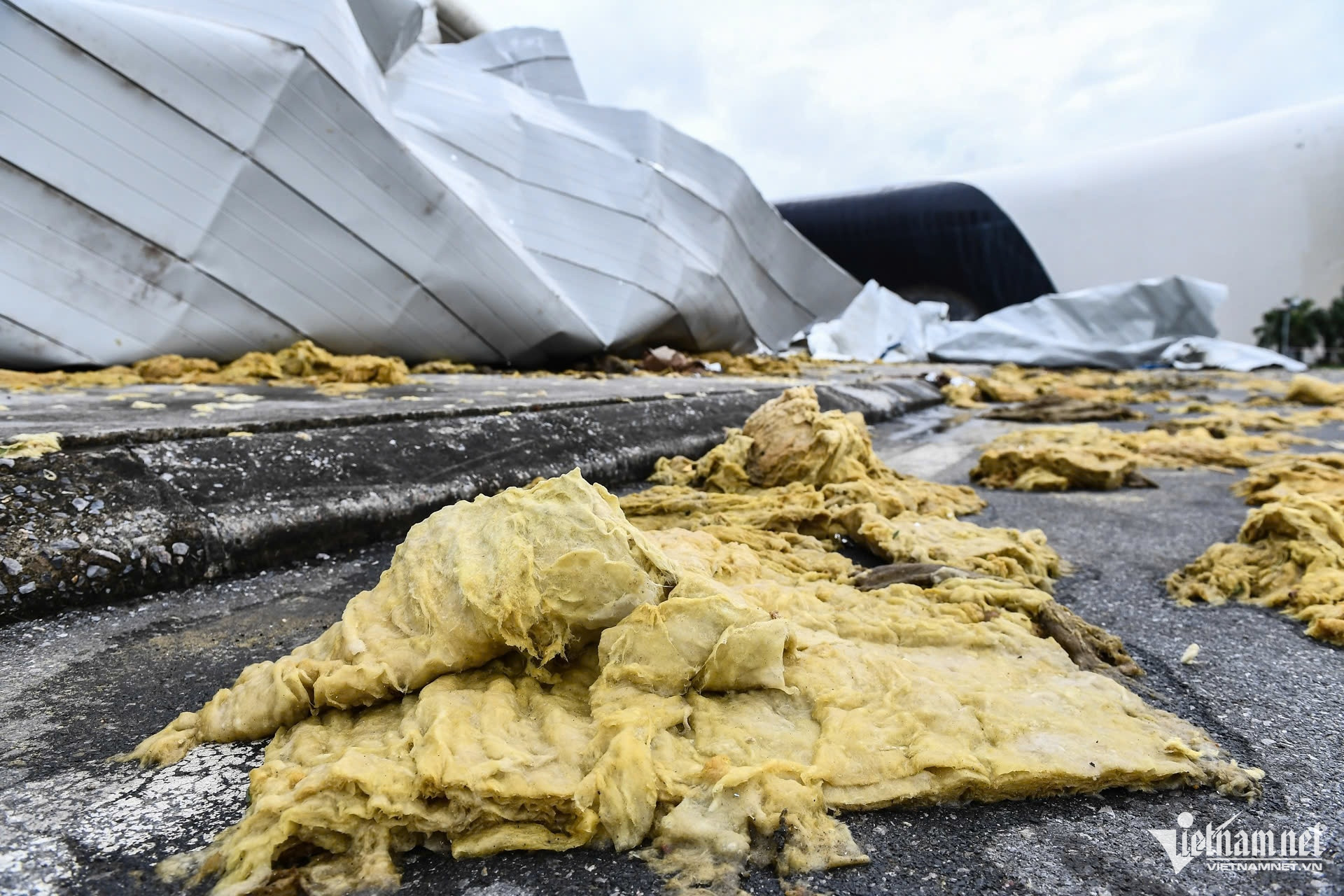 Ngoài ra, phần cách nhiệt dưới lớp tôn cũng bị xé toạc rồi rơi đầy trong khuôn viên cung.